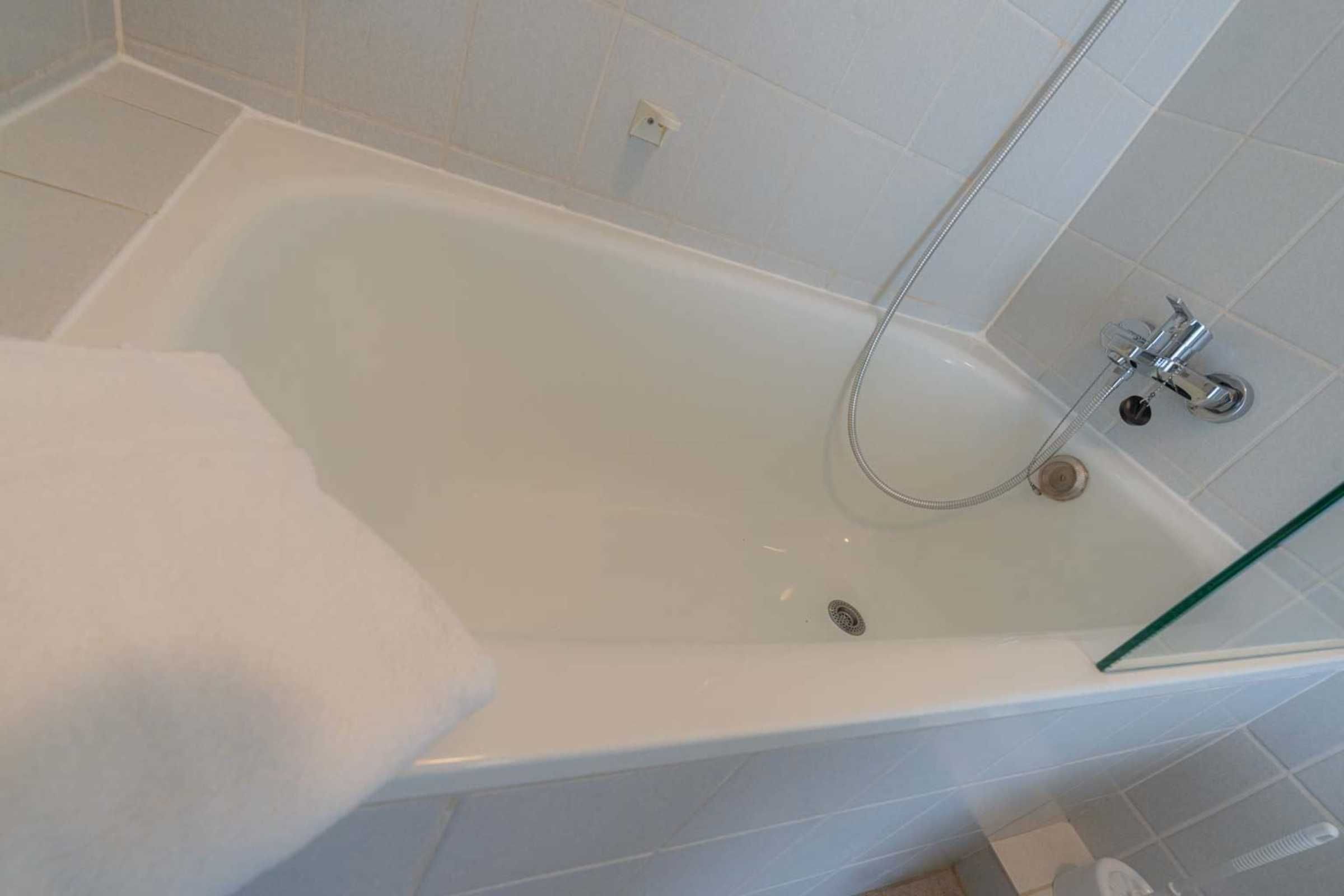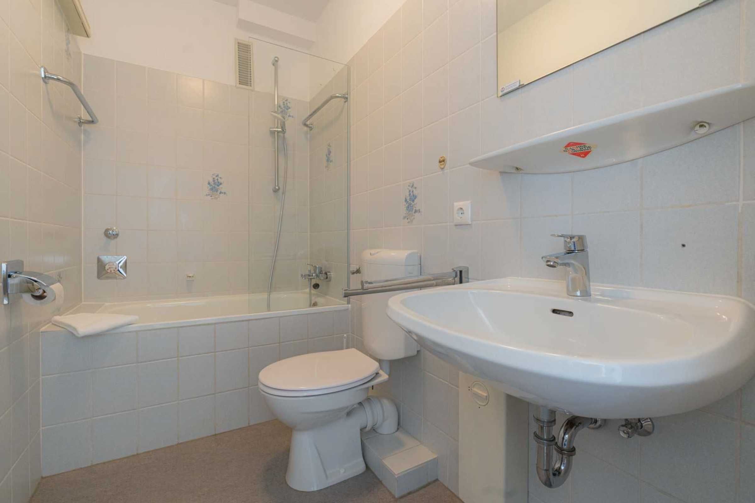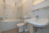 Badezimmer (Wannenbad) mit Badewanne mit Dusch-Handstück, WC und Heizkörper.