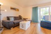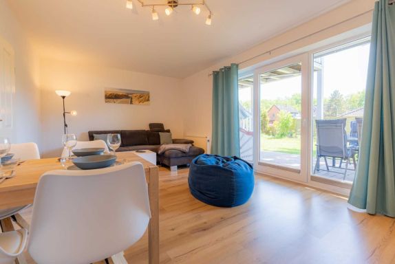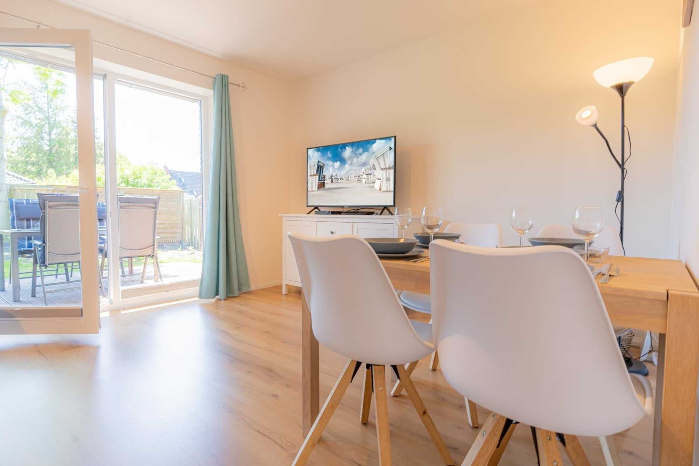 Wohnzimmer mit Schlafsofa (140x200cm), großem SMART-TV (Kabel mit Magenta), BluRay-Player und Spiele-Sammlung. Direkter Zugang zur möblierten Gartenterrasse nach Süden mit Strandkorb. Offene Küche mit Backofen, Geschirrspüler, Kühlschrank mit Gefrierfach und Esstisch mit 4 Stühlen.