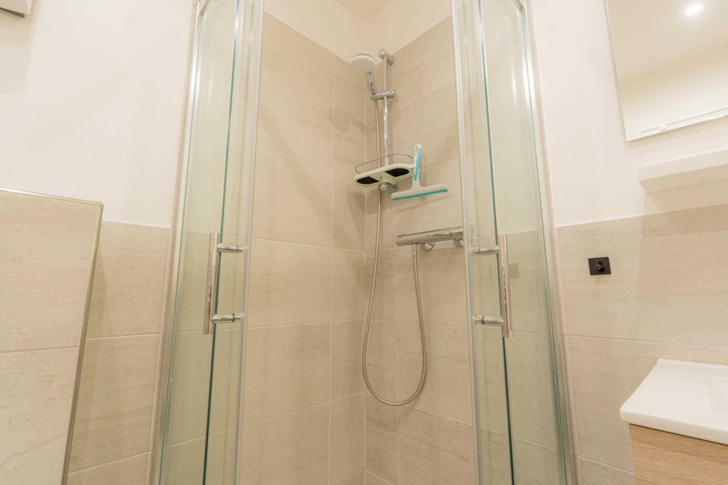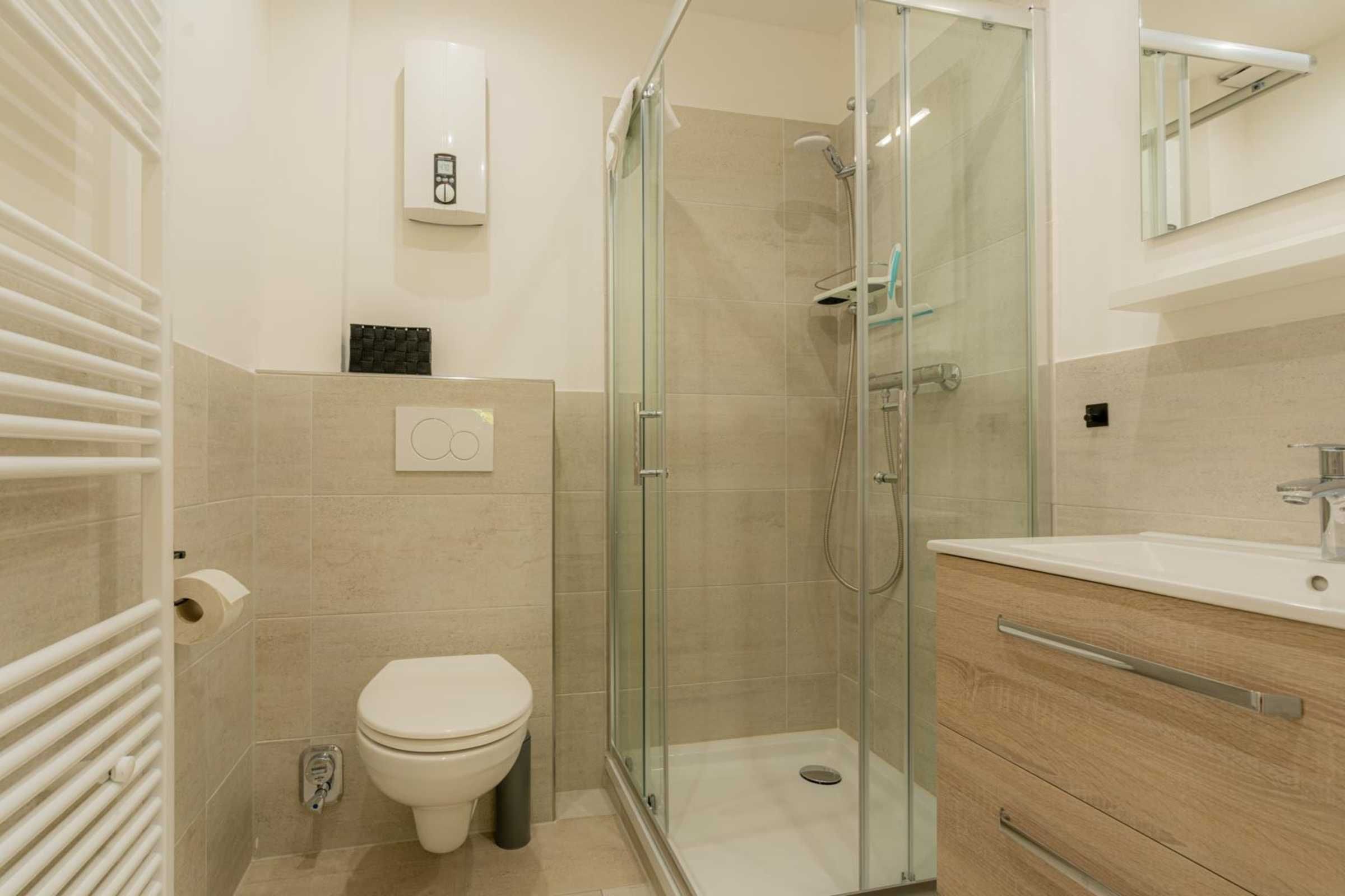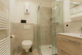 Badezimmer (Duschbad) mit Dusche, WC, Handtuchwärmer und Föhn.