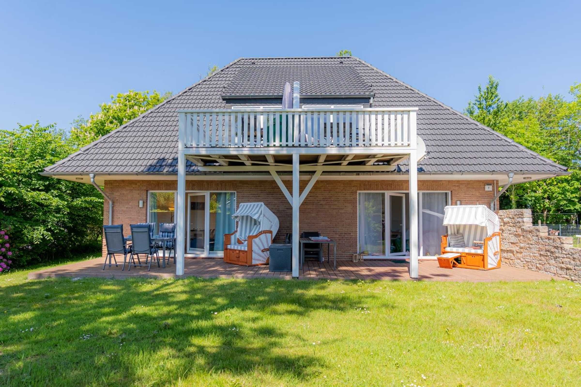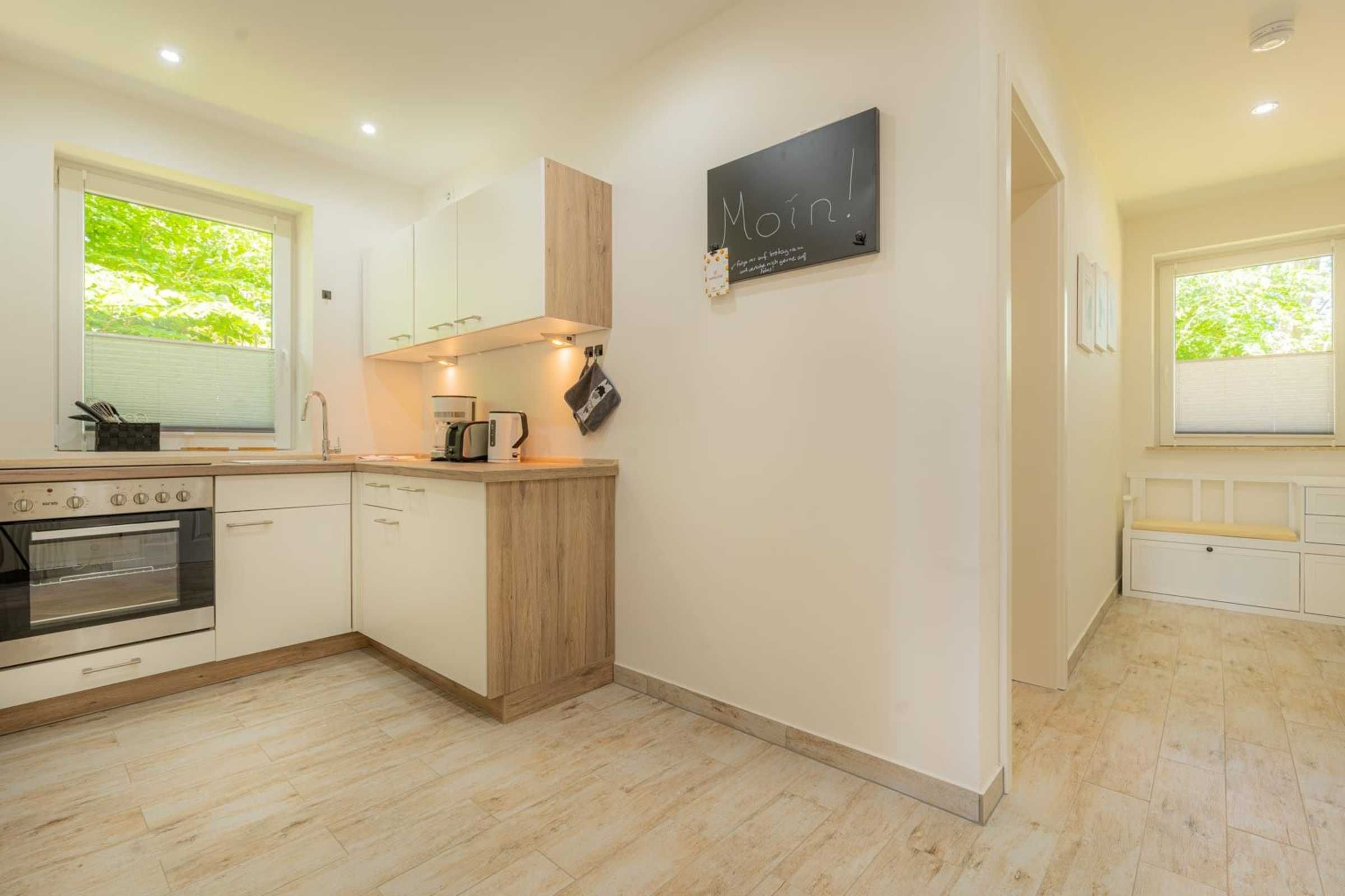 Wohnzimmer mit Schlafsofa (140x200cm), großem SMART-TV (Kabel mit Magenta), BluRay-Player und Spiele-Sammlung. Direkter Zugang zur möblierten Gartenterrasse nach Süden mit Strandkorb. Offene Küche mit Backofen, Geschirrspüler, Kühlschrank mit Gefrierfach und Esstisch mit 4 Stühlen.