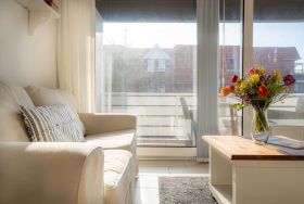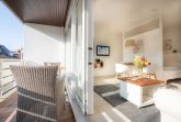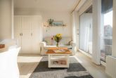 Wohnzimmer mit Sofa, TV (Kabel), Stereo-Kompaktanlage mit CD-Player und Esstisch für 3 Personen. Offene Küche mit Backofen, Mikrowelle, Geschirrspüler und Kühlschrank mit Gefrierfach. Direkter Zugang zum möblierten Balkon nach Süden.