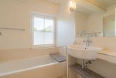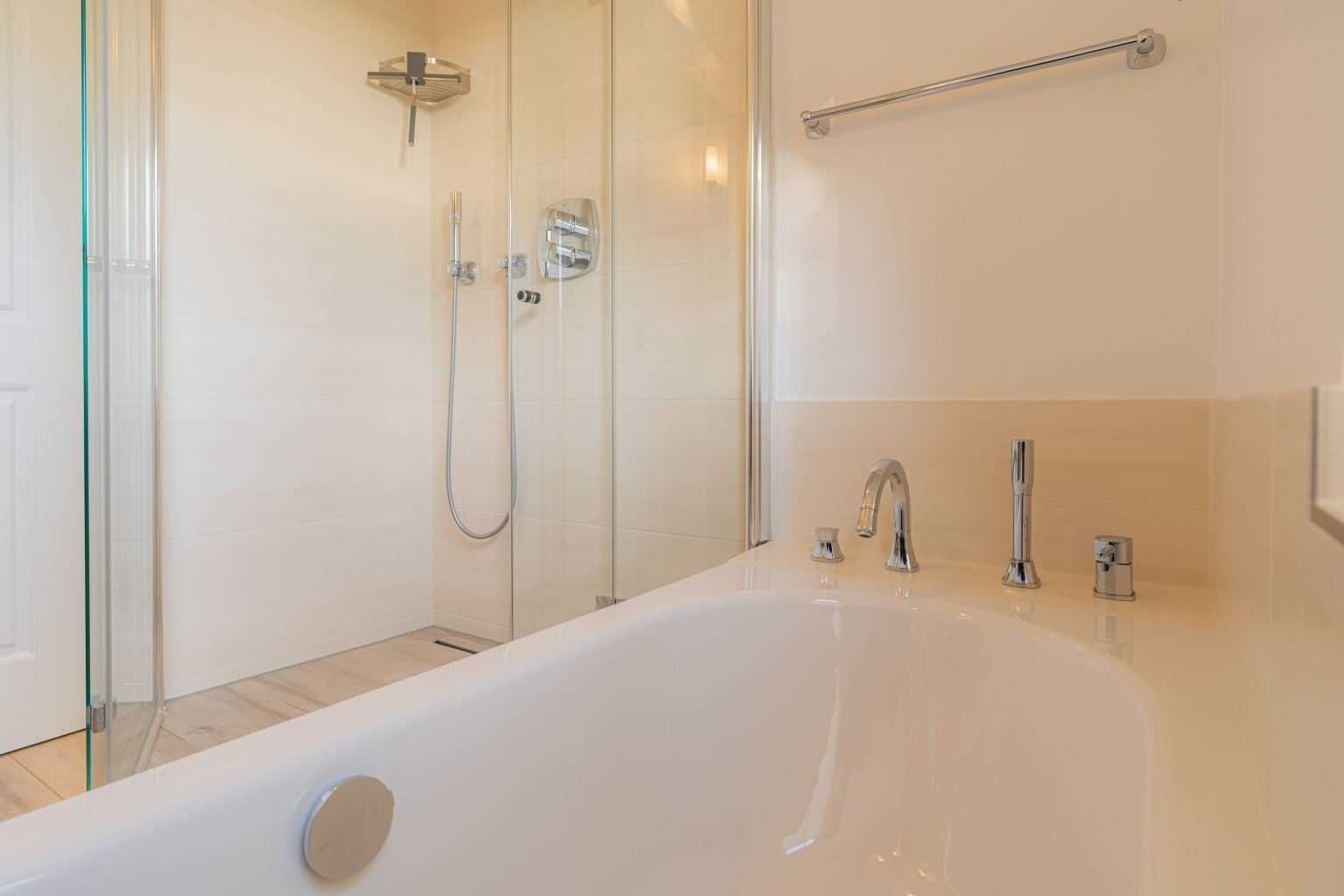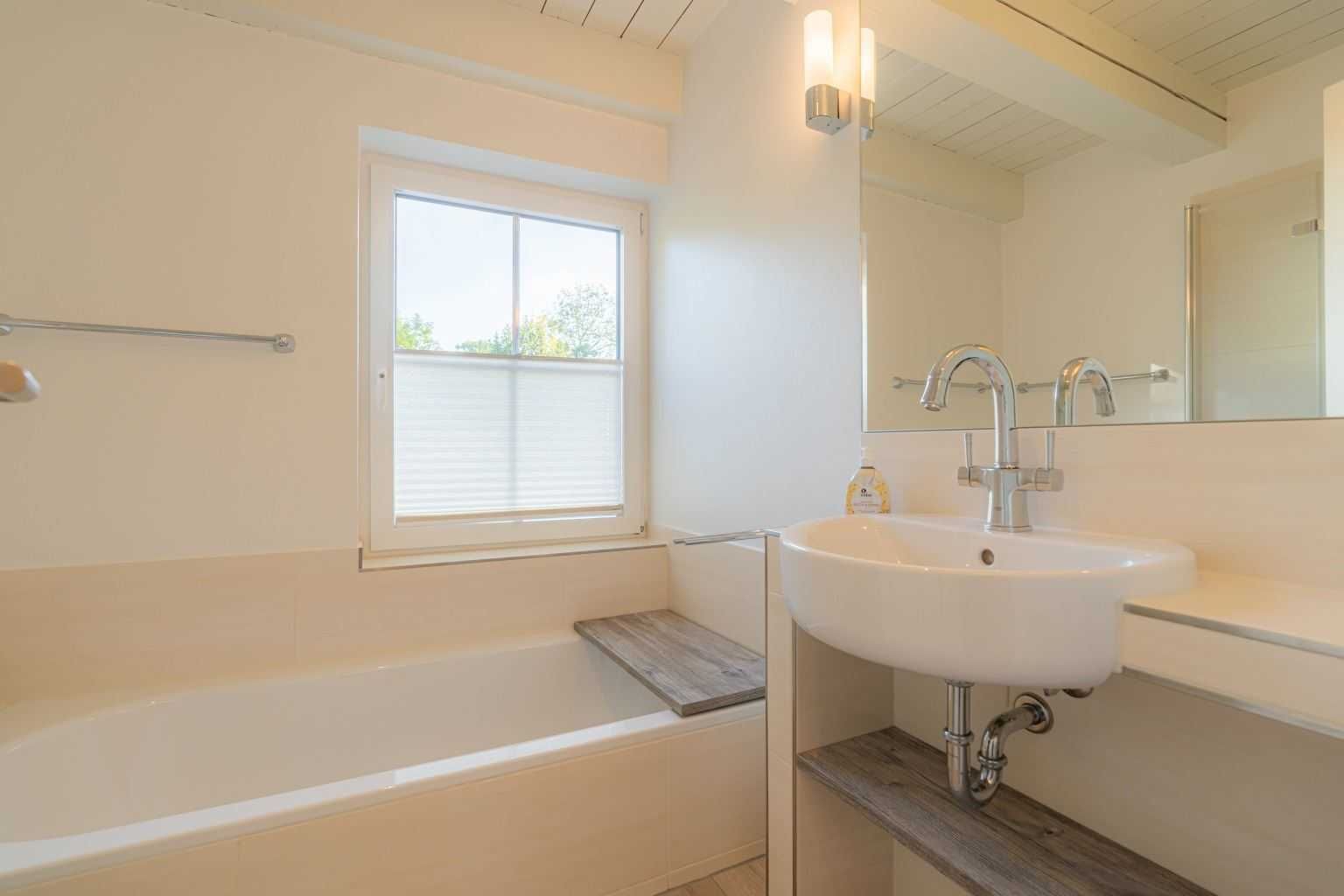 Badezimmer (Vollbad) mit Badewanne, bodengleicher Regen-Dusche, WC und Tageslicht.