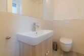 Flur mit Garderoben- und Haushaltschrank sowie ein Gäste-WC mit Tageslicht im Eingangsbereich. Vor dem Haus sind drei Pkw-Stellplätze, wovon einer zu diesem Domizil gehört. Ein abschließbarer Fahrradschuppen gehört zum Domizil. Im großen Garten befinden sich Kinderspielgeräte.