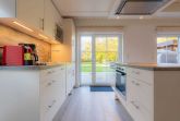 Wohnzimmer mit großem Ecksofa, SMART-TV (Sat) und Kaminofen. Essbereich mit großem Esstisch, gemütlichem Sofa für 2-3 Personen und 3 Stühlen. Offene Küche mit Kochinsel, Backofen, Mikrowelle, Geschirrspüler, Kühlschrank mit Gefrierfach und Waschtrockner. Direkter Zugang zur möblierten Garten-Terrasse nach Nordwesten.