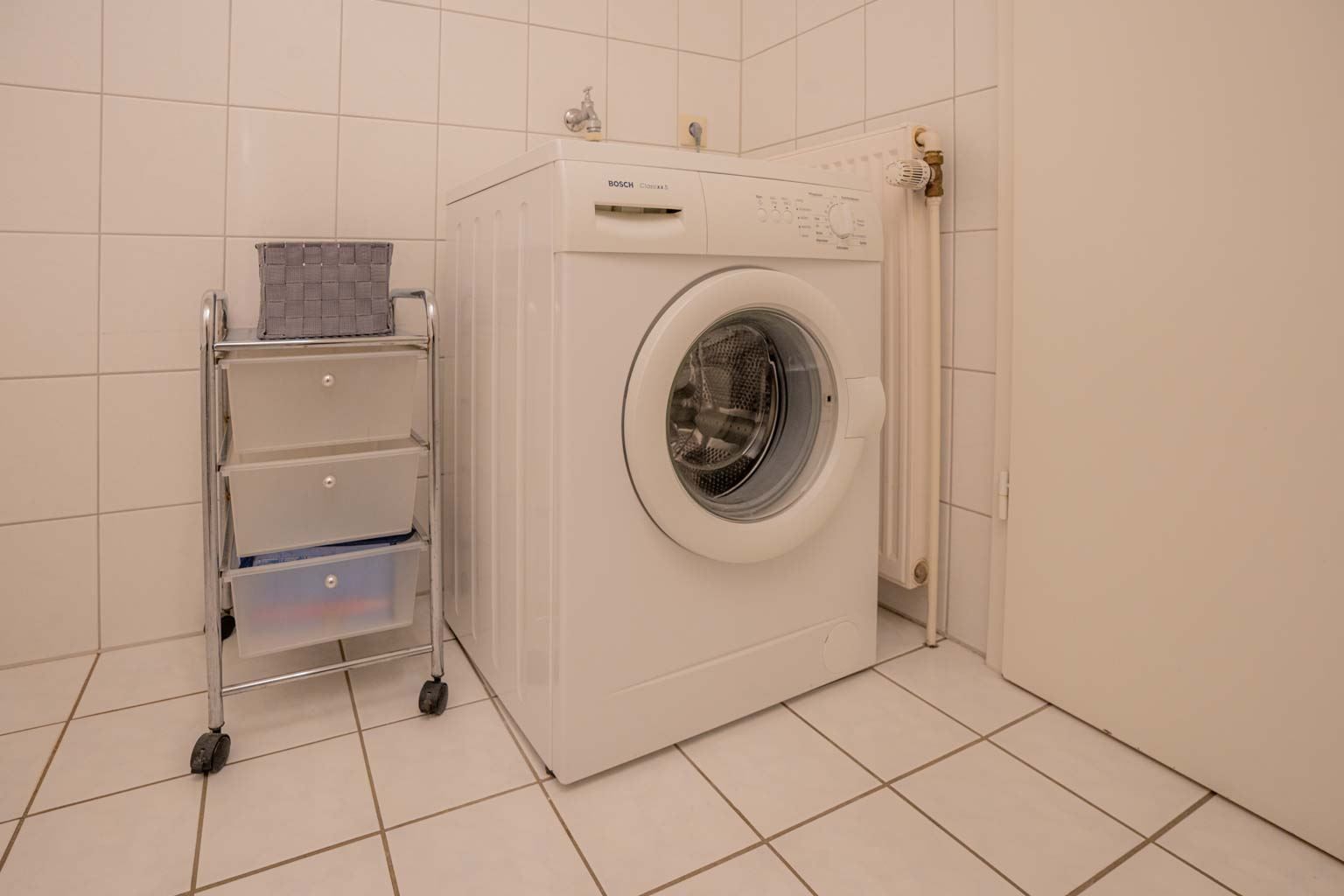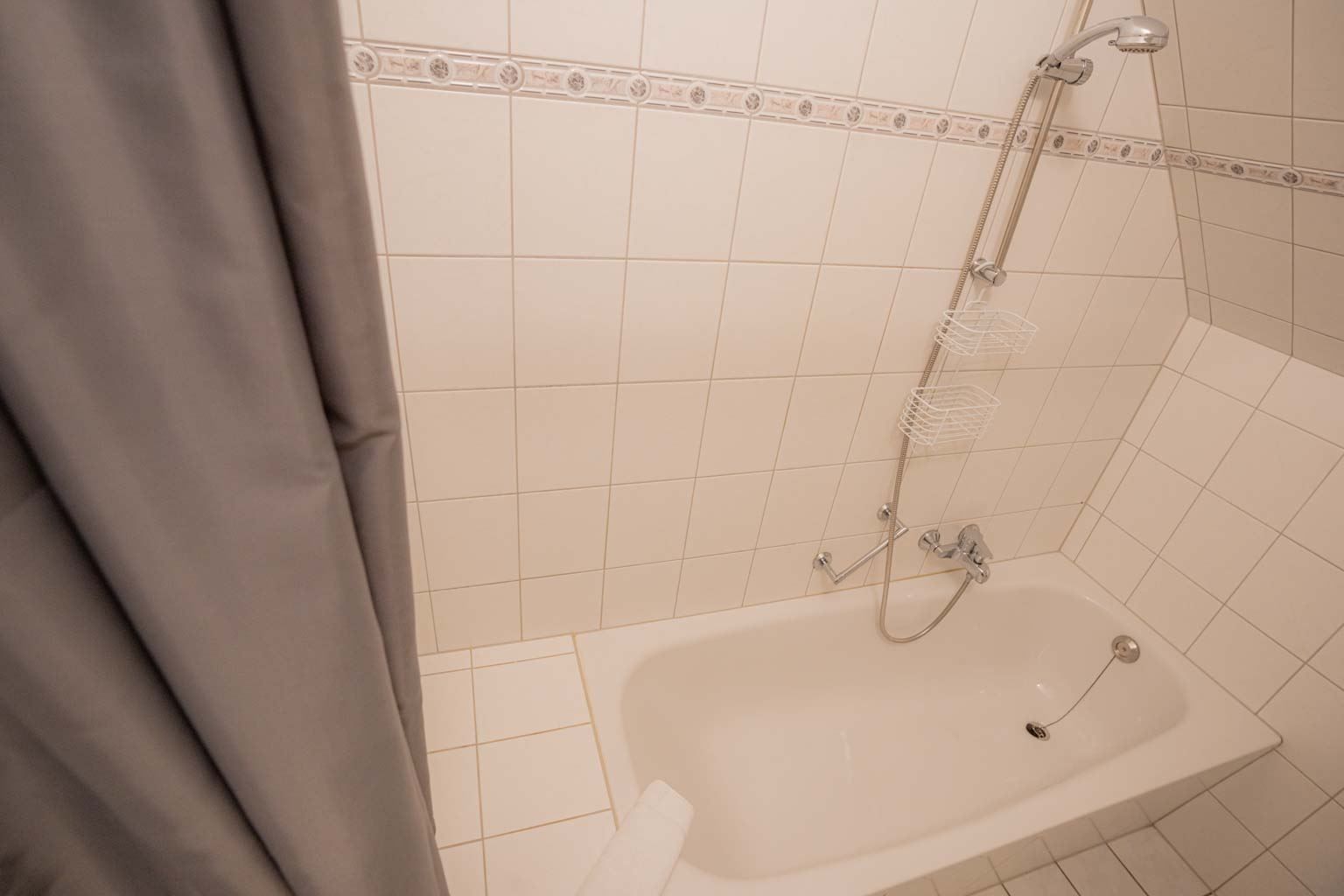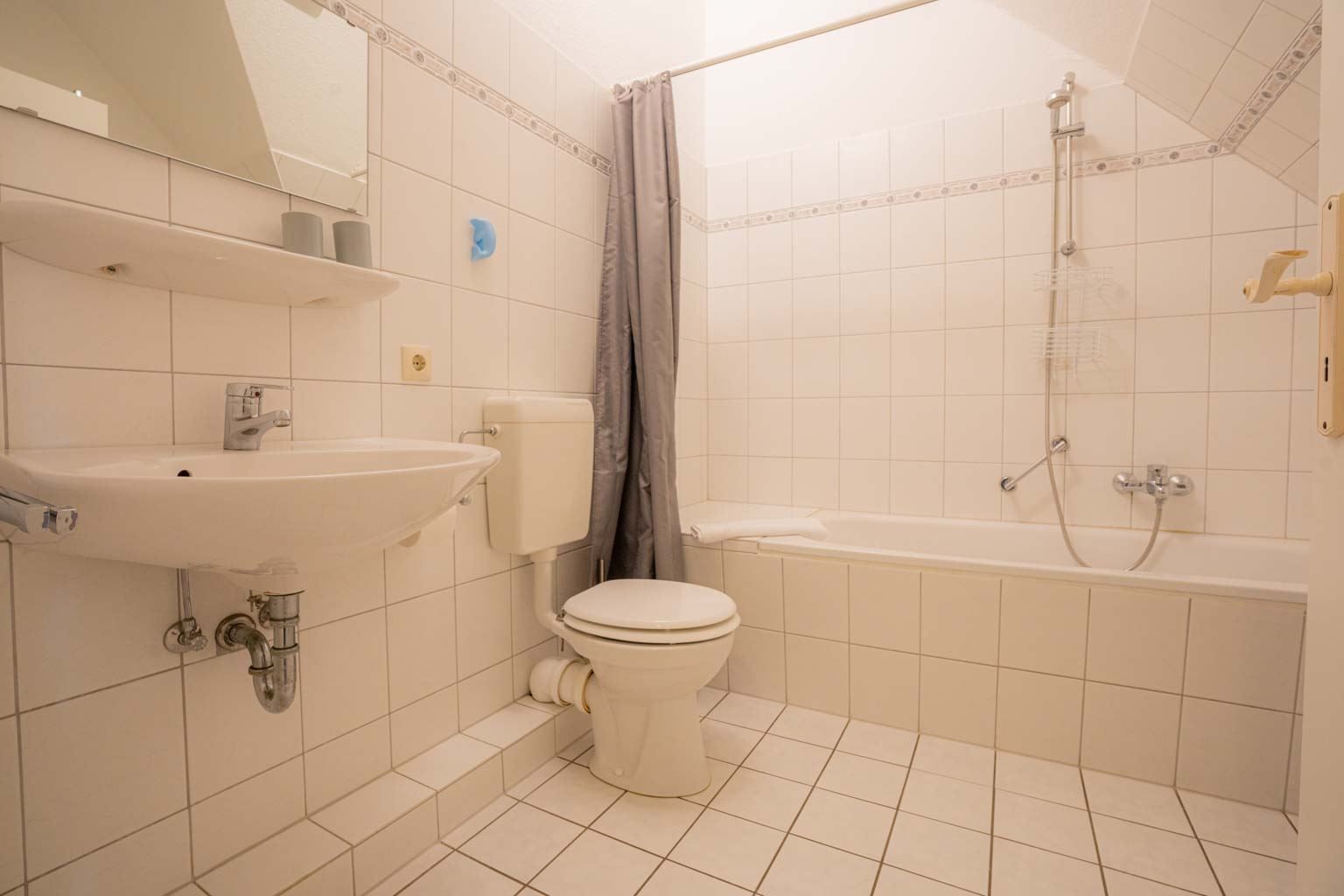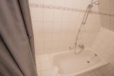 Badezimmer (Vollbad) mit Badewanne mit Duschhandstück, WC, Föhn und Waschmaschine.
