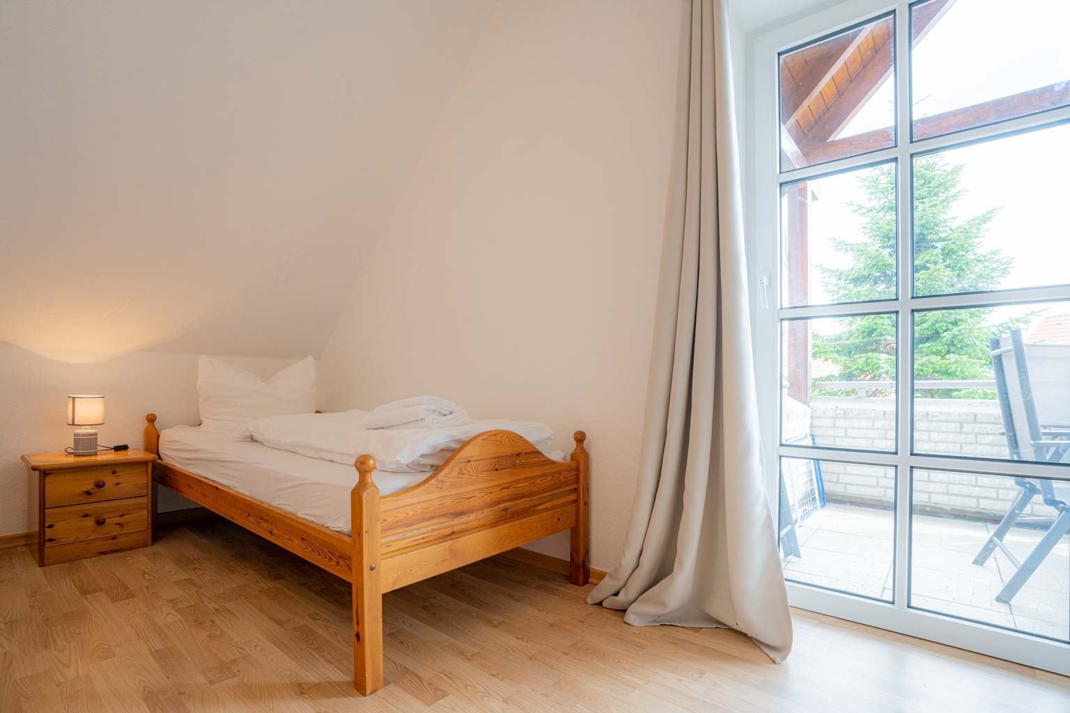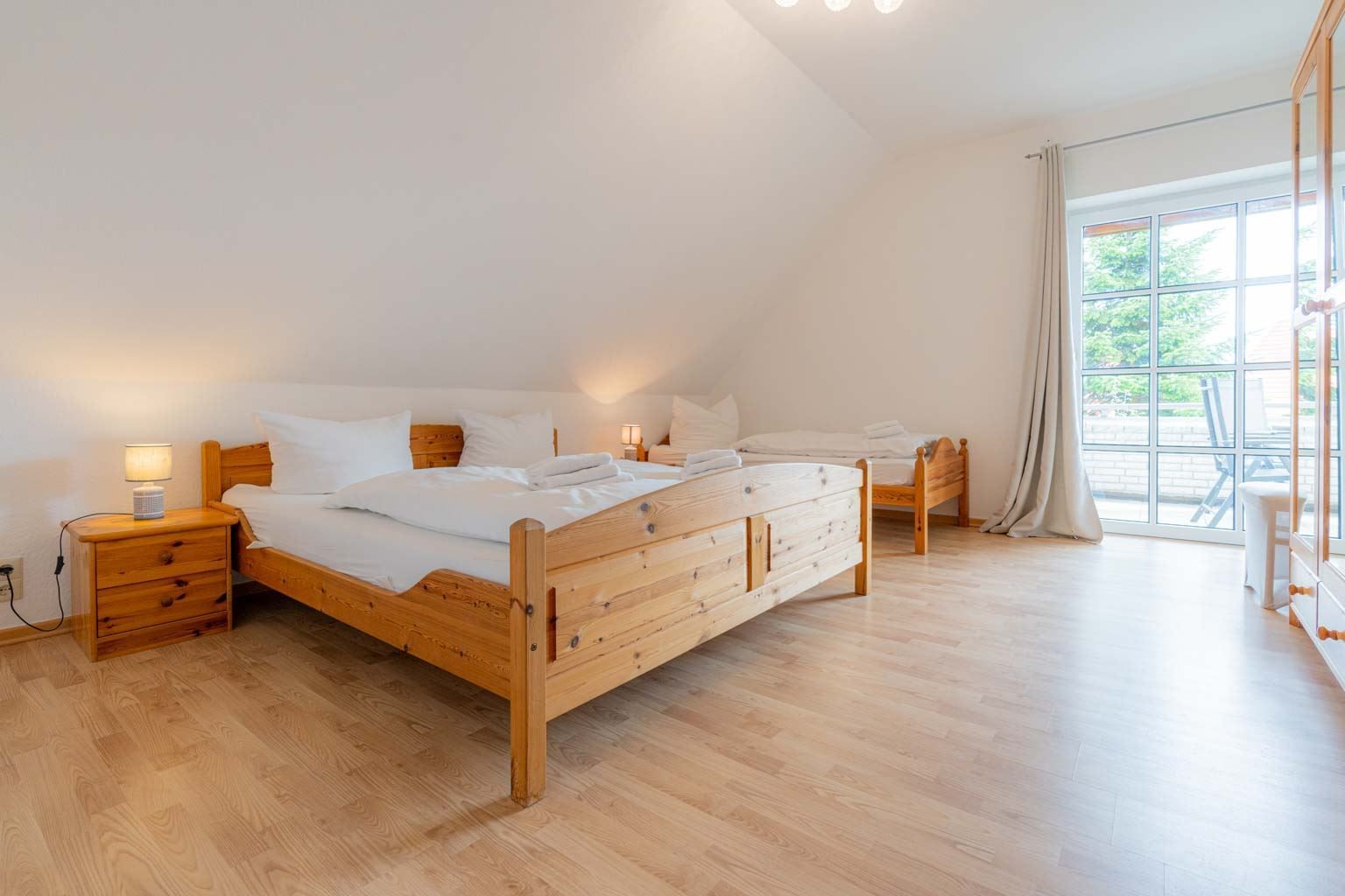 Schlafzimmer mit Doppelbett (2x 90x200cm), Einzelbett (90x200cm), Kleiderschrank, Stuhl, Staubsauger und direktem Zugang zum Balkon.