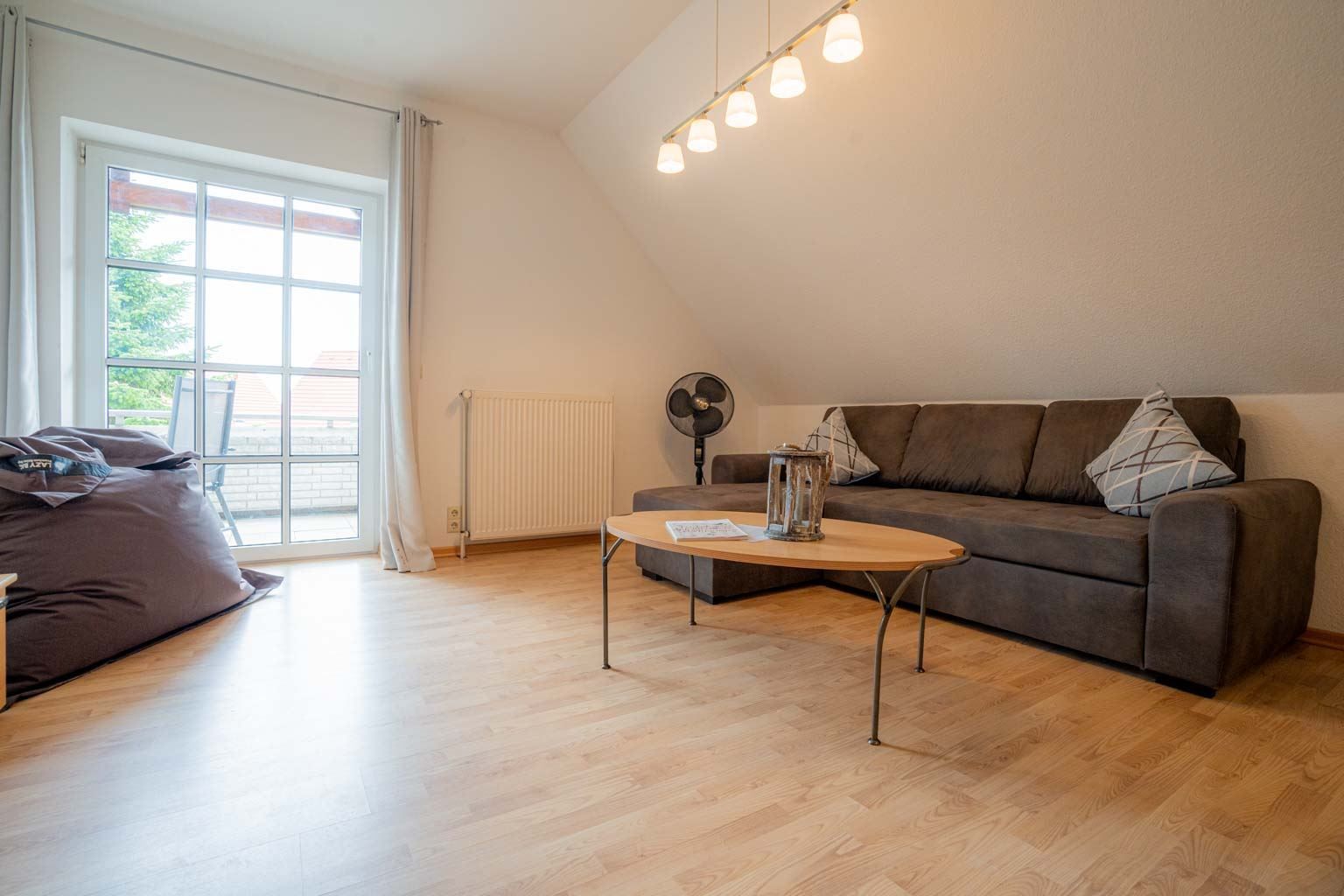 Wohnzimmer mit einem ausziehbaren Schlafsofa (150x200cm), 2 Sesseln, SMART-TV (Sat), Bluetooth-Soundbar, Stereo-Kompaktanlage und Esstisch mit 6 Stühlen. Direkter Zugang zum möblierten, überdachten Balkon nach Südosten. Offene Küche mit Backofen, Geschirrspüler und Kühlschrank mit Gefrierfach.