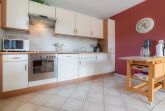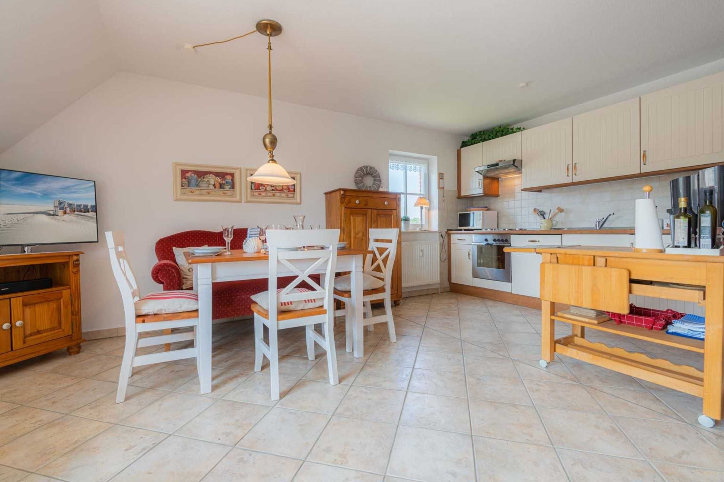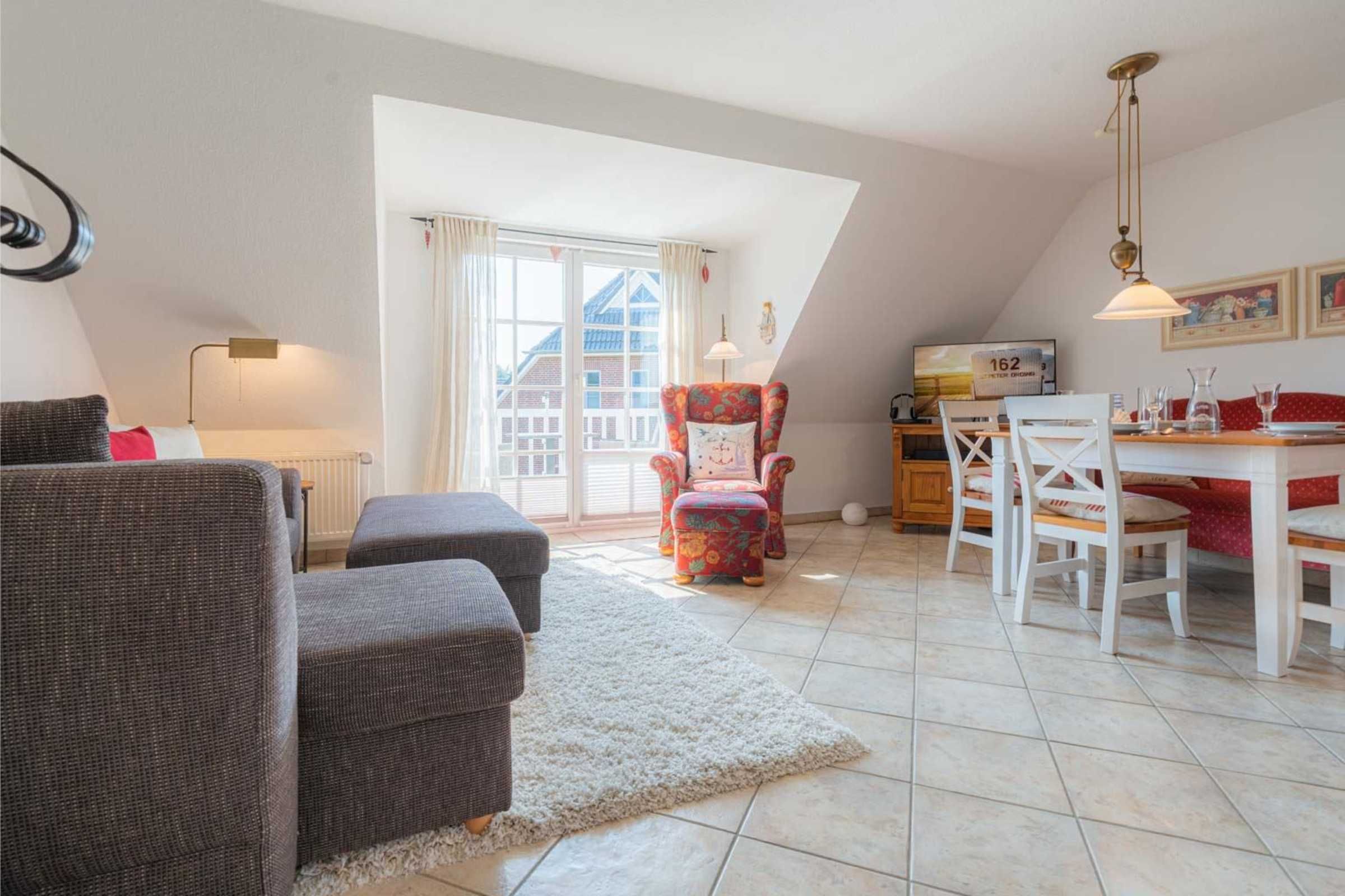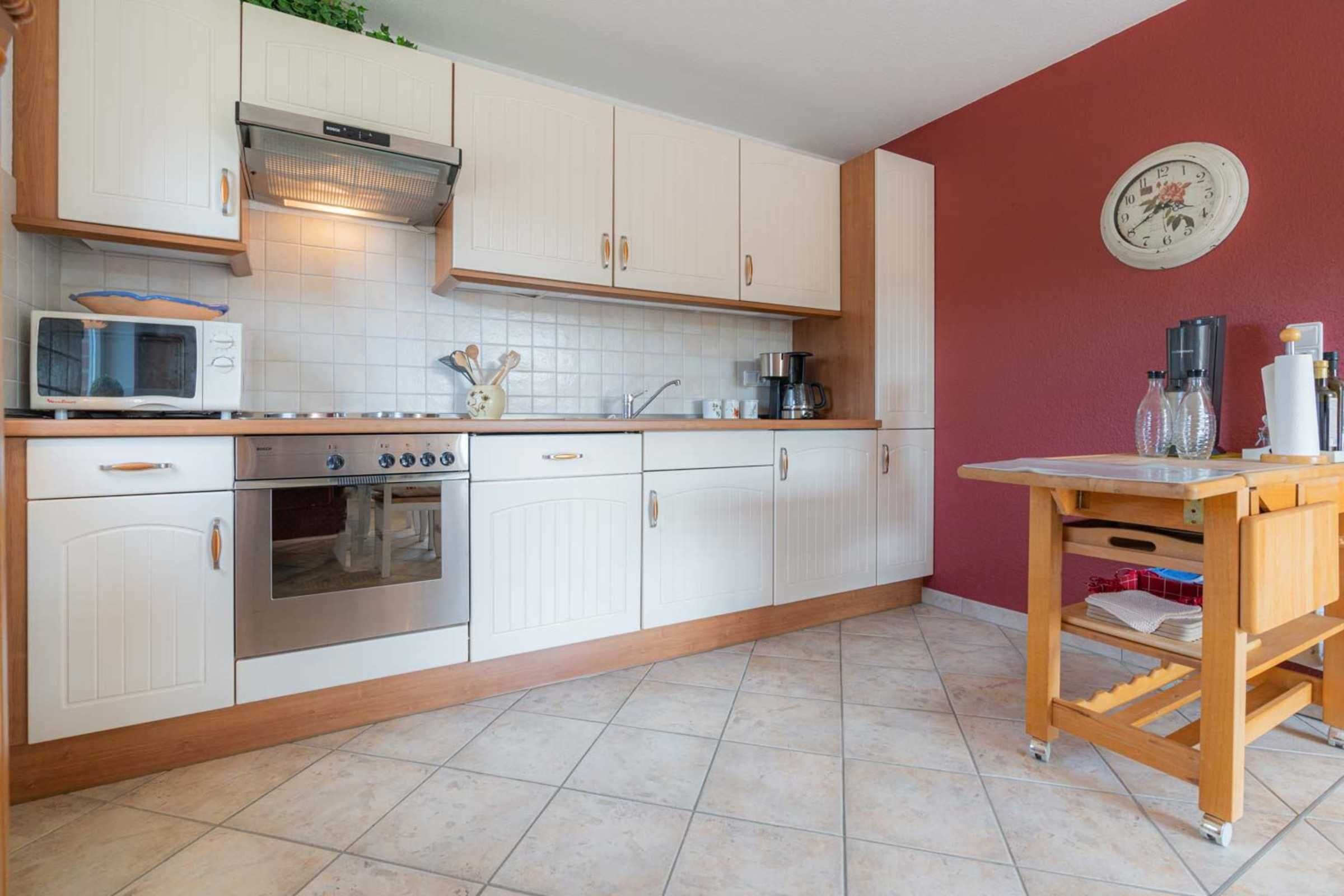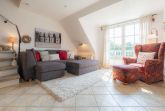 Wohnzimmer mit Wohnlandschaft, Ohrensessel mit Fußhocker, TV (Sat) mit Soundbar und Blueray-Player, Esstisch mit Sofa und 3 Stühlen. Direkter Zugang zum möblierten Balkon nach Süden. Offene Küche mit Induktionsherd, Backofen, Mikrowelle, Geschirrspüler und Kühlschrank mit Gefrierfach.