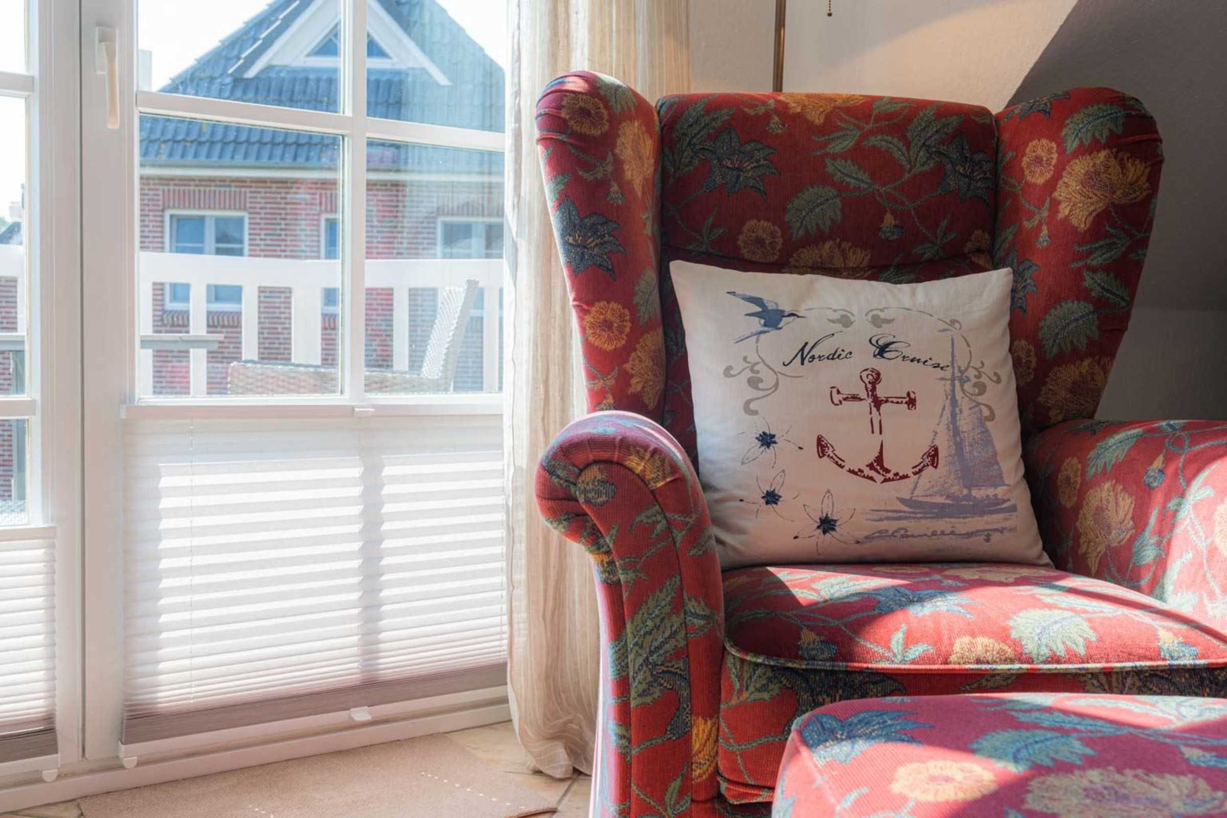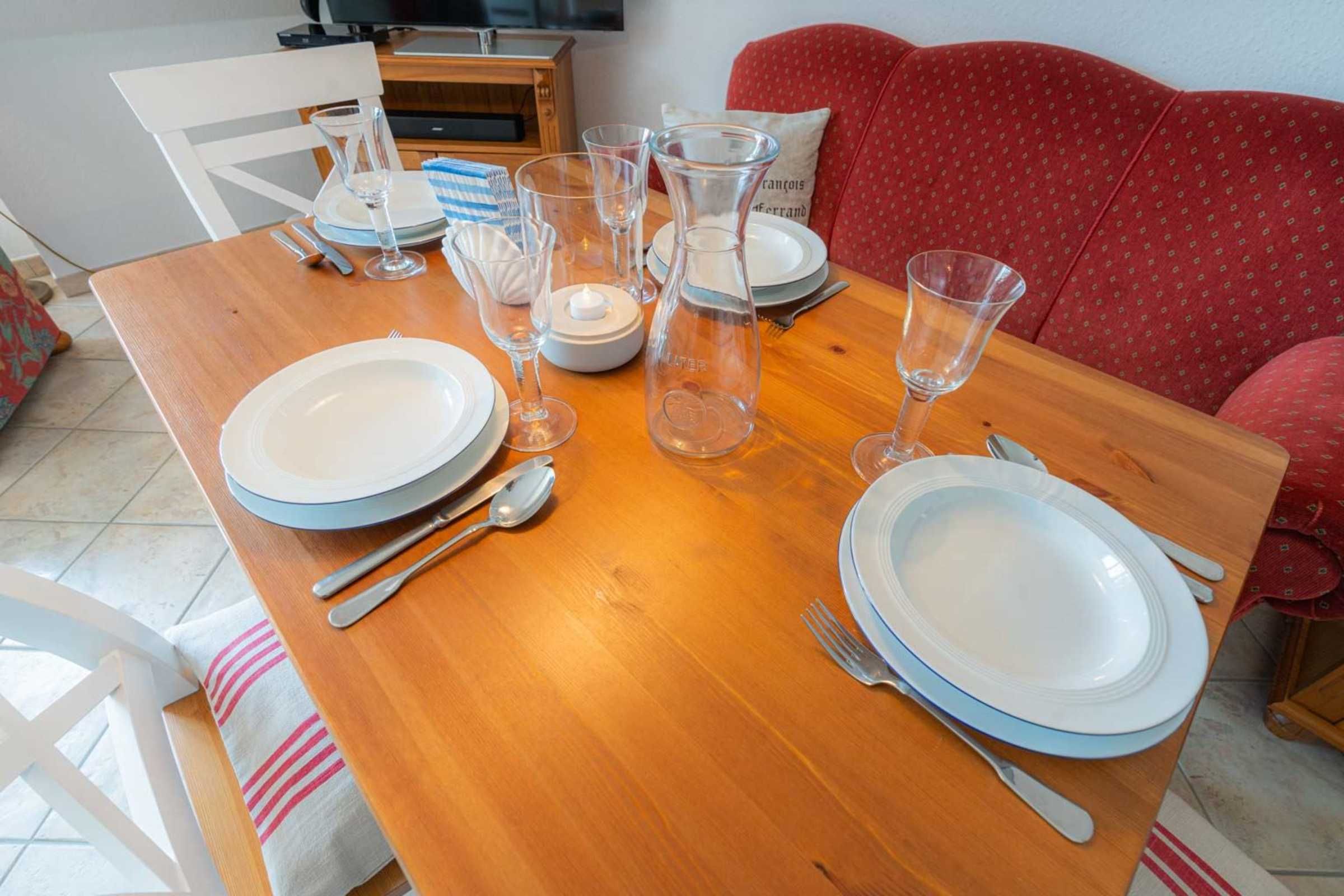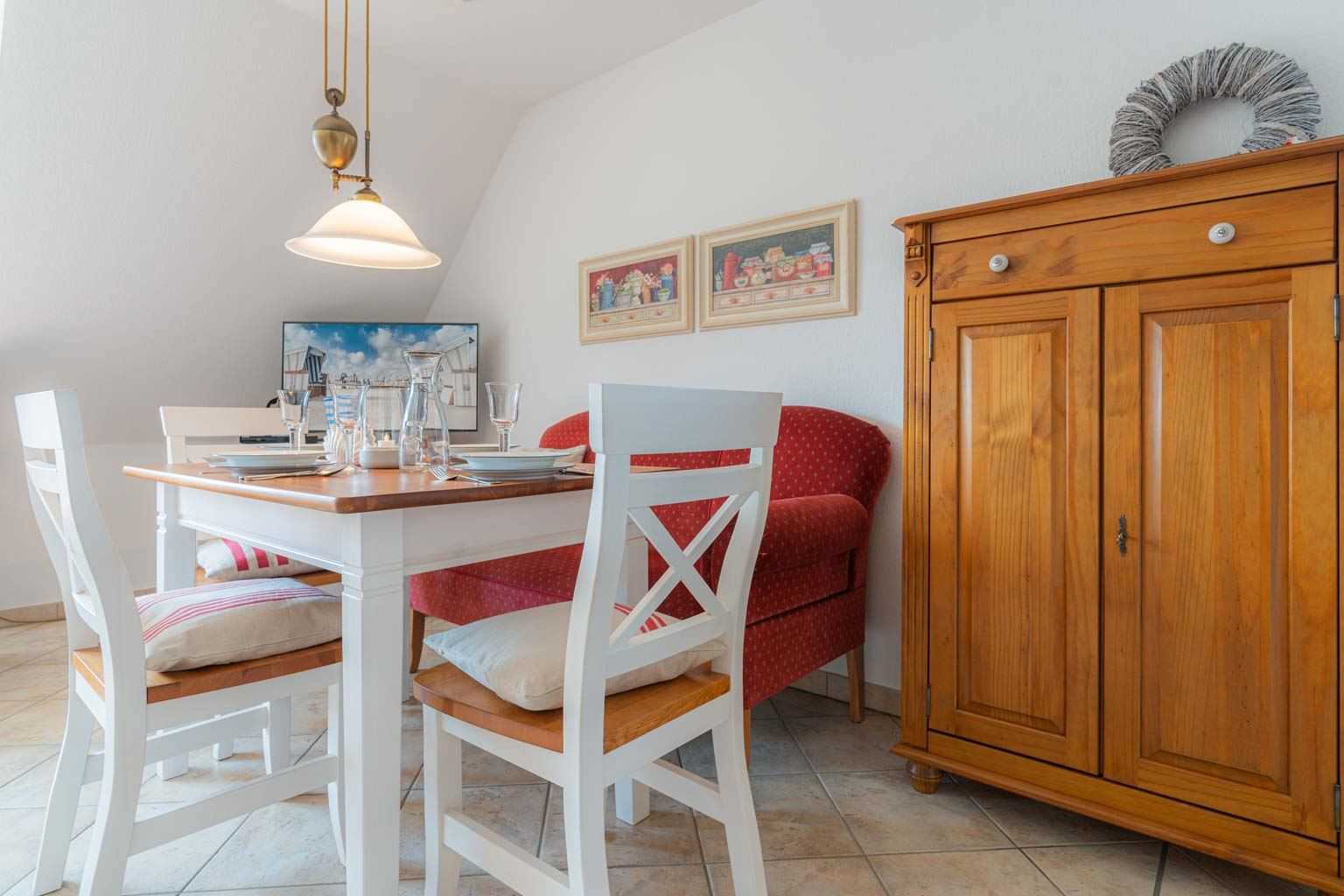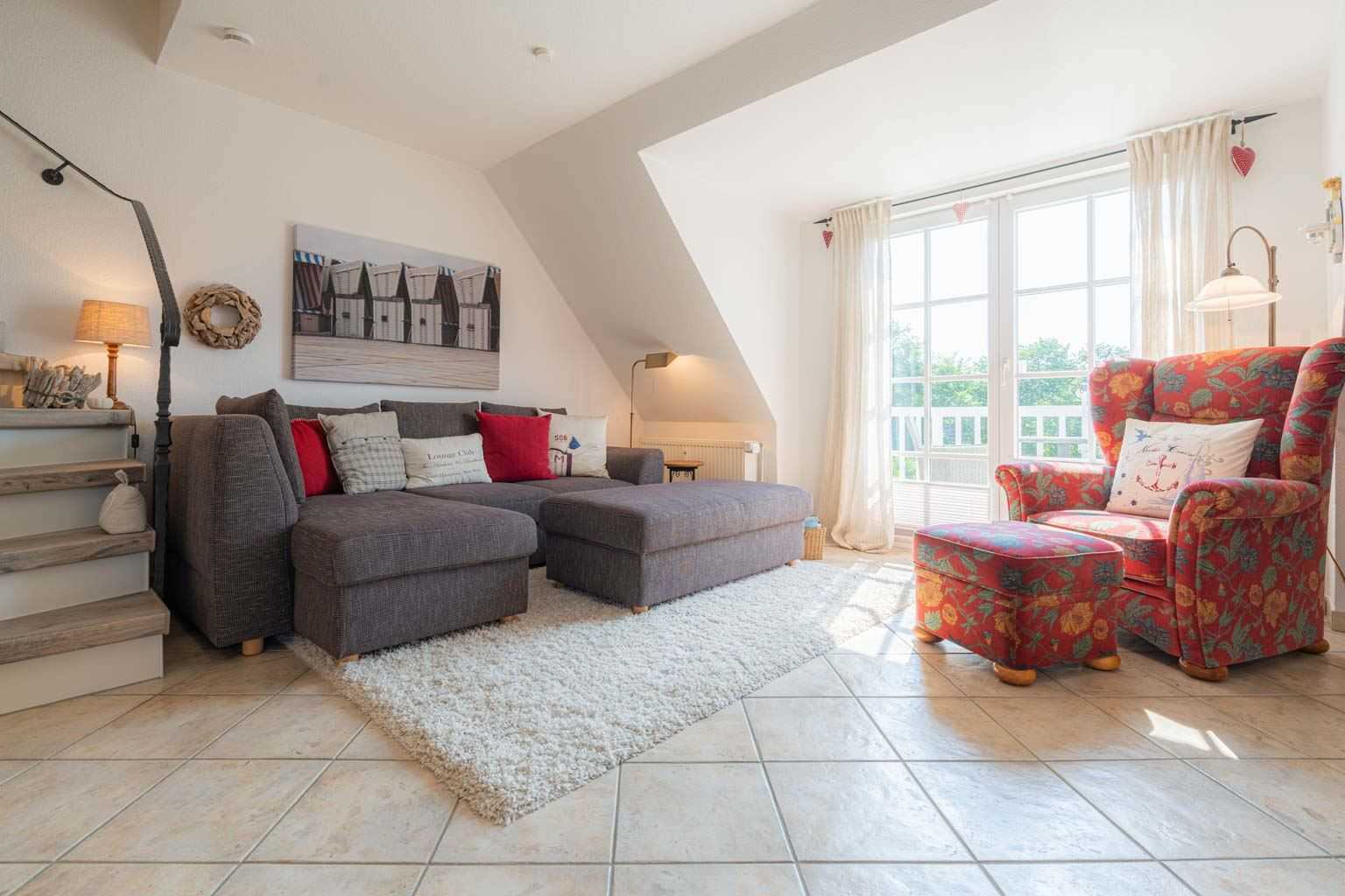 Wohnzimmer mit Wohnlandschaft, Ohrensessel mit Fußhocker, TV (Sat) mit Soundbar und Blueray-Player, Esstisch mit Sofa und 3 Stühlen. Direkter Zugang zum möblierten Balkon nach Süden. Offene Küche mit Induktionsherd, Backofen, Mikrowelle, Geschirrspüler und Kühlschrank mit Gefrierfach.