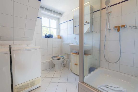Badezimmer (Duschbad) mit Dusche (80x70cm, Eintritt 30cm), Handtuchwärmer, WC, Waschmaschine, Trockner, Föhn und Tageslicht.