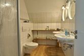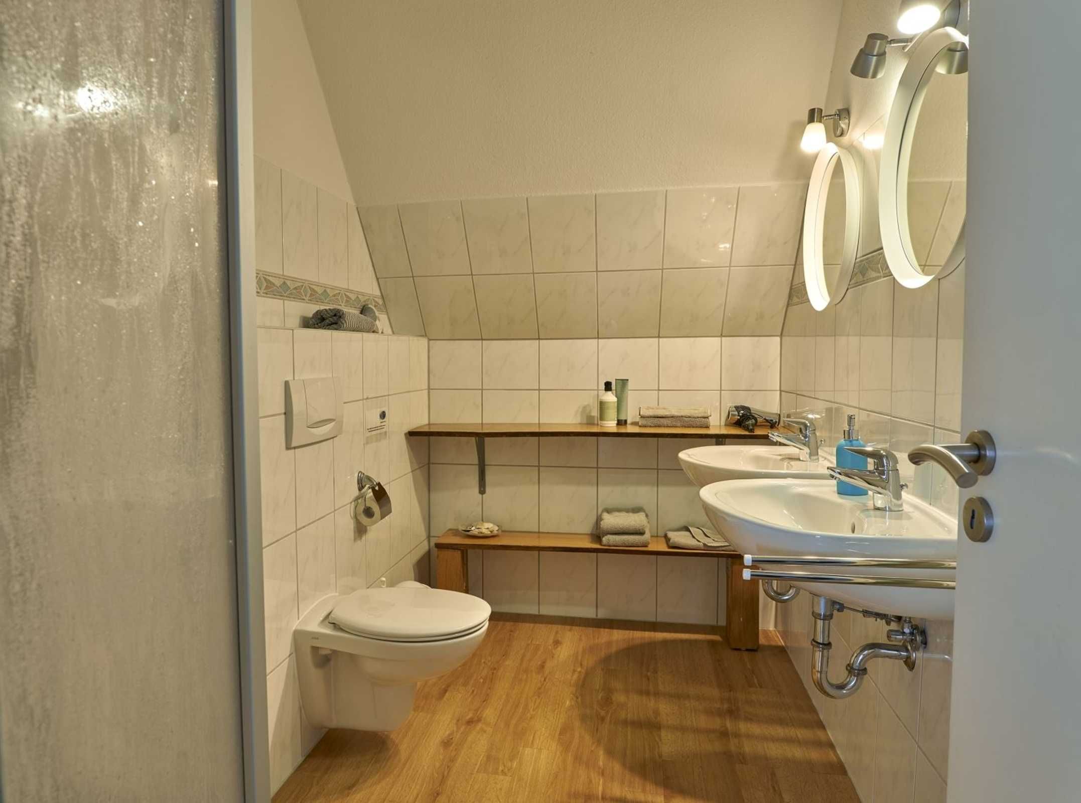 Badezimmer (Duschbad) mit Dusche, 2 Waschbecken, WC und Föhn.