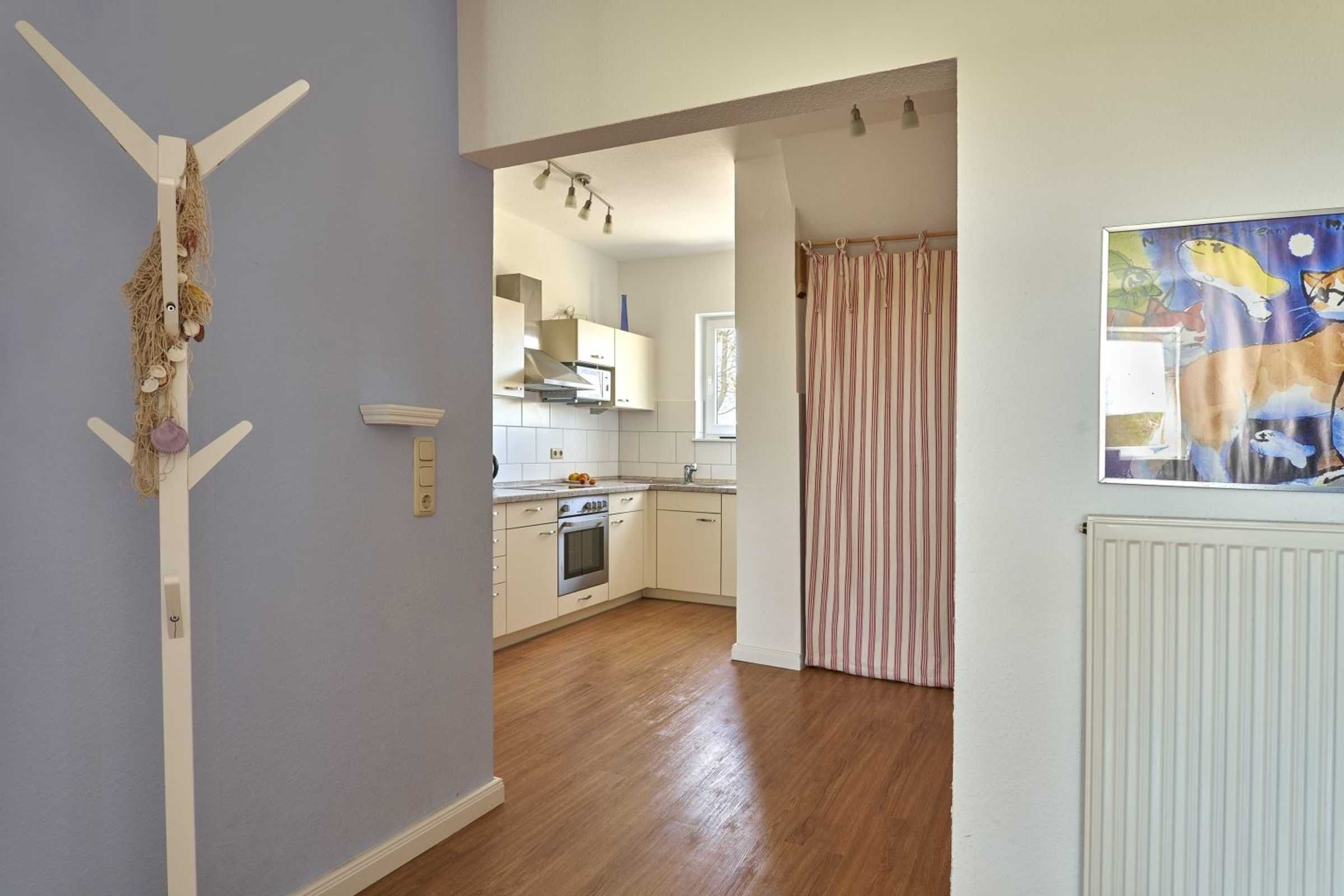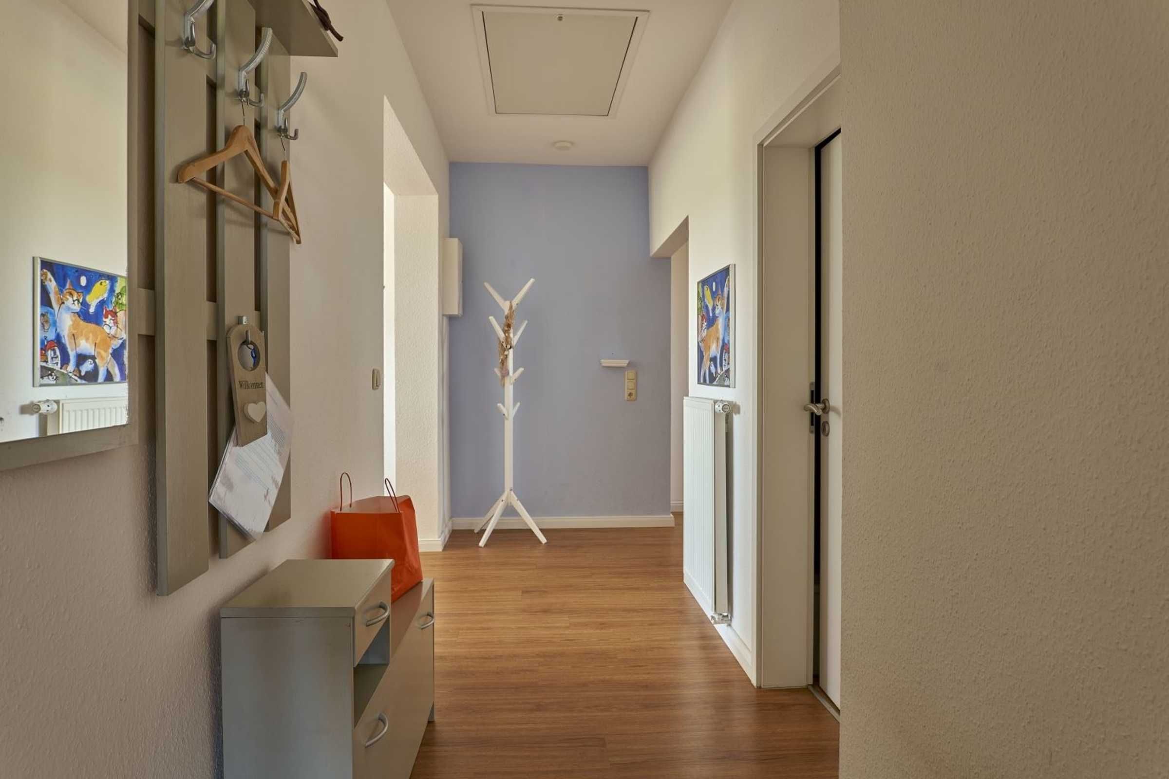 Flur mit Garderobe, Schuhfach und Spiegel im Eingangsbereich der Wohnung. In diesem Domizil sind ein kostenloses Kinderreisebett (nur Gestell, ohne Bettzeug) und ein Kinderhochstuhl vorhanden und können kostenlos genutzt werden.