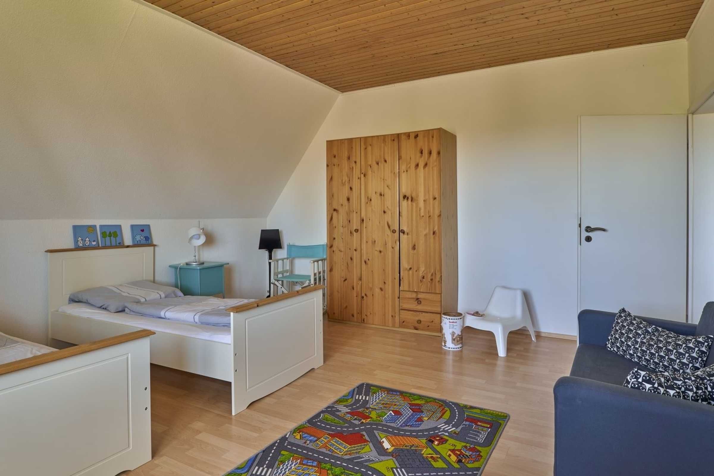 2. Schlafzimmer mit 3 Einzelbetten (je 90x200cm), Kleiderschrank und Tisch mit 2 Stühlen.