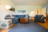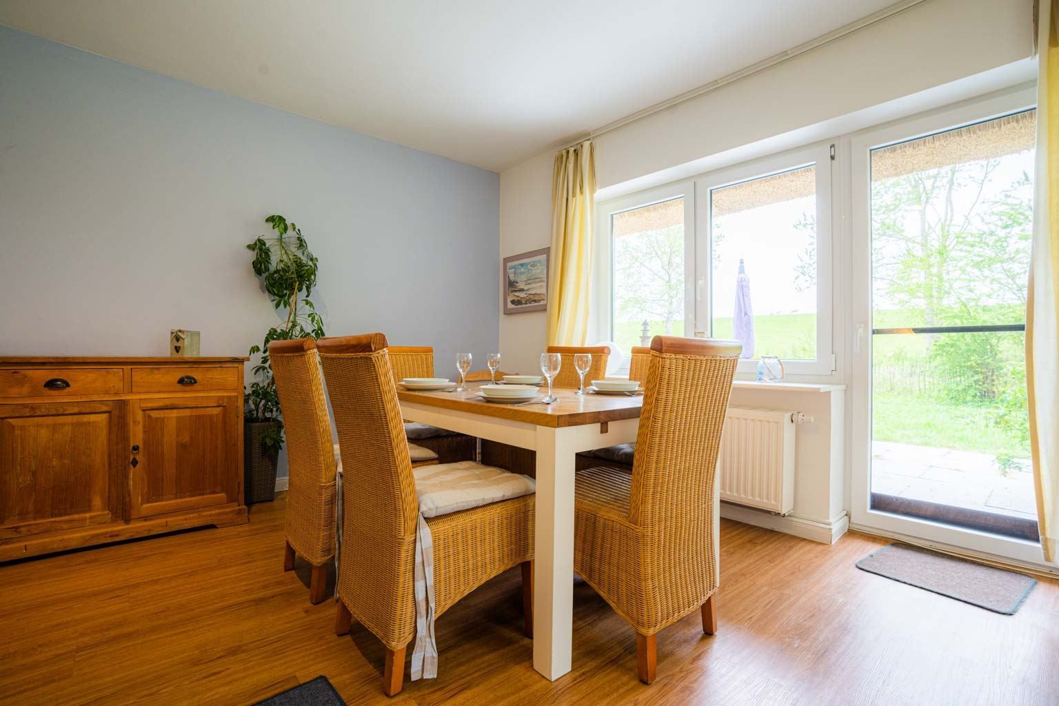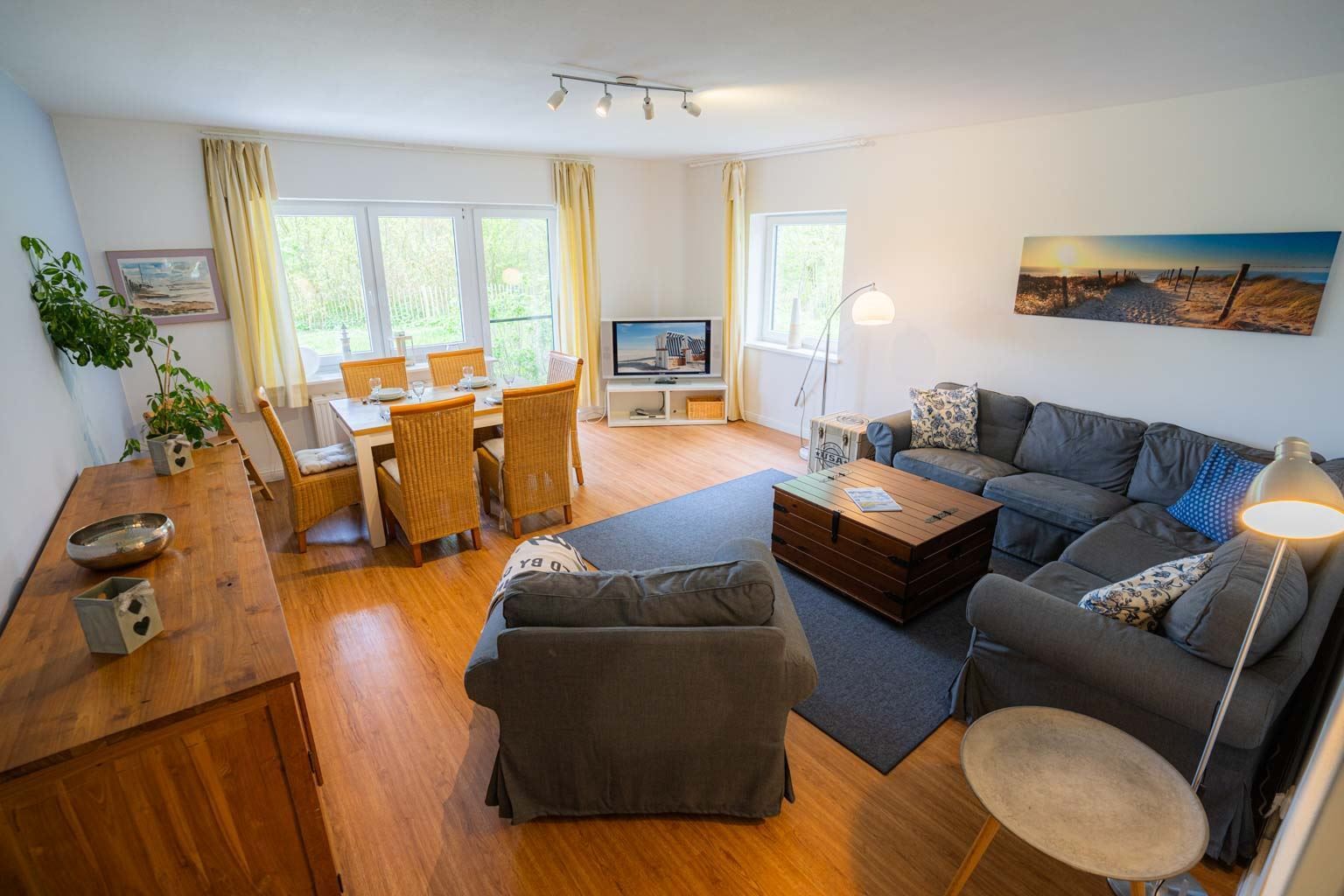 Wohnzimmer mit großem Ecksofa, Sessel, TV (Sat) mit DVD-Player und Esstisch mit 6 Stühlen. Kostenloses WLAN. Direkter Zugang zur möblierten Süd-Terrasse mit Blick auf den Deich.
