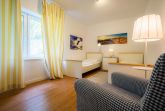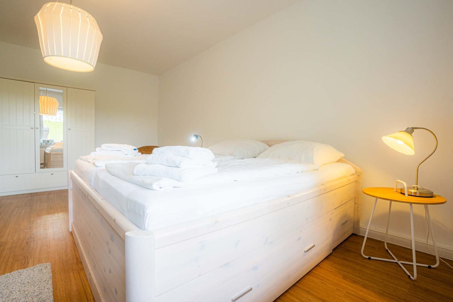 1. Schlafzimmer mit Doppelbett (2x 90x200cm), einfachem (ausklappbarem Schlaf-) Sofa (115x200cm) und Kleiderschrank.