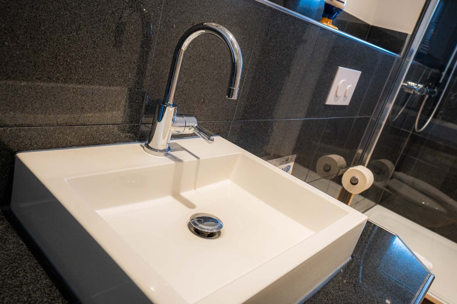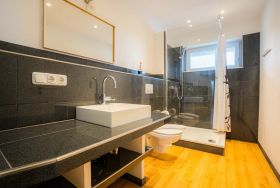 Badezimmer (Duschbad) mit Dusche, WC, Tageslicht und Föhn.