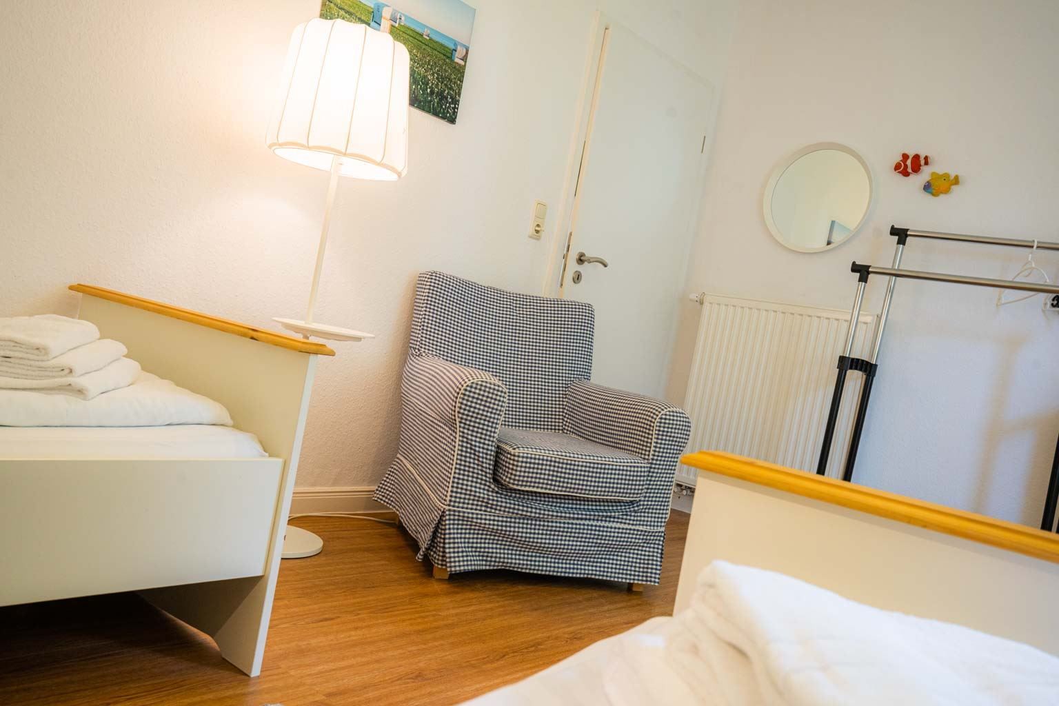 2. Schlafzimmer mit 2 Einzelbetten (je 90x200cm), Sessel und Kleiderschrank.
