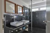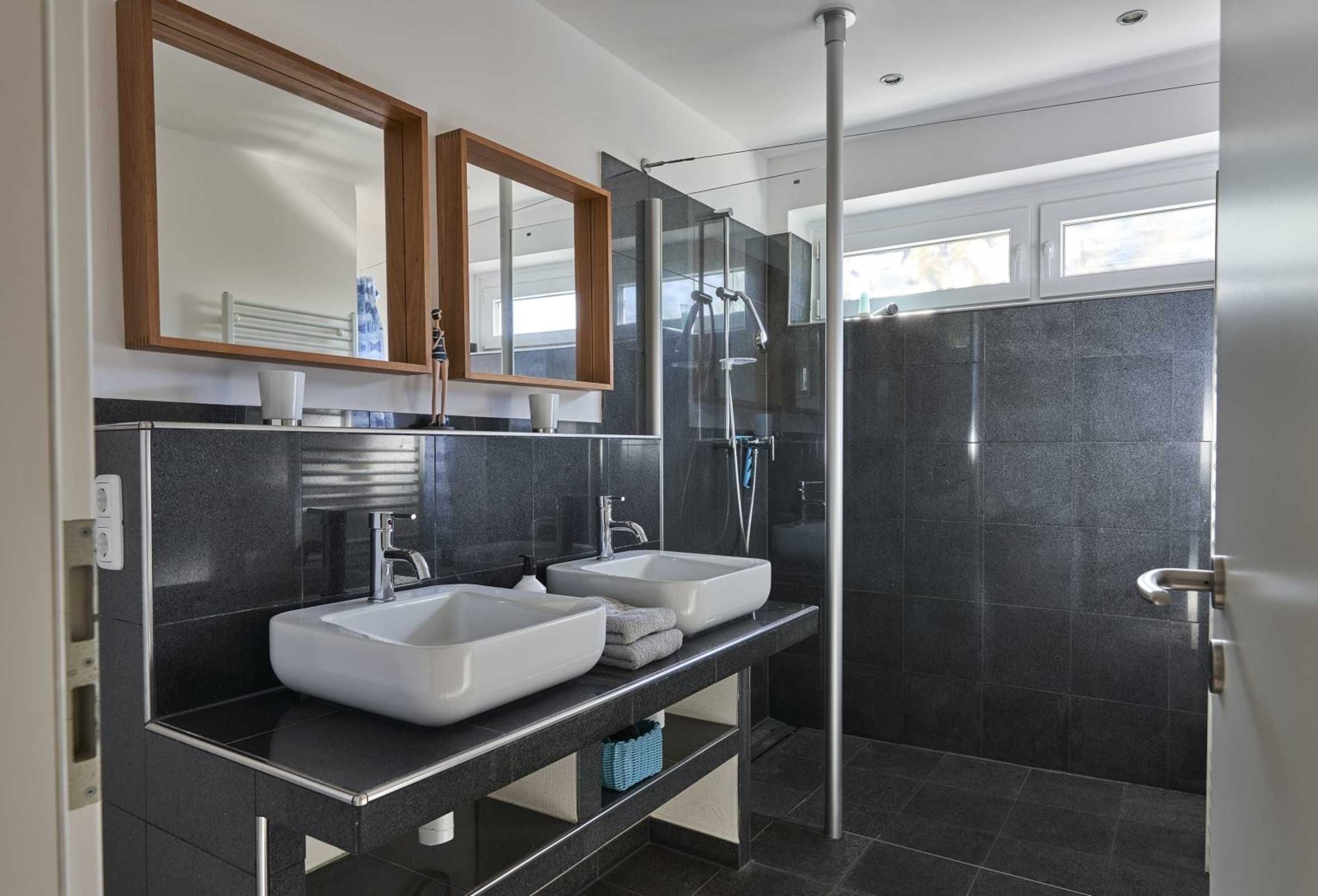 2. Badezimmer (Duschbad) mit bogengleicher Dusche, WC, 2 Waschbecken, Handtuchwärmer, Tageslicht und Föhn.