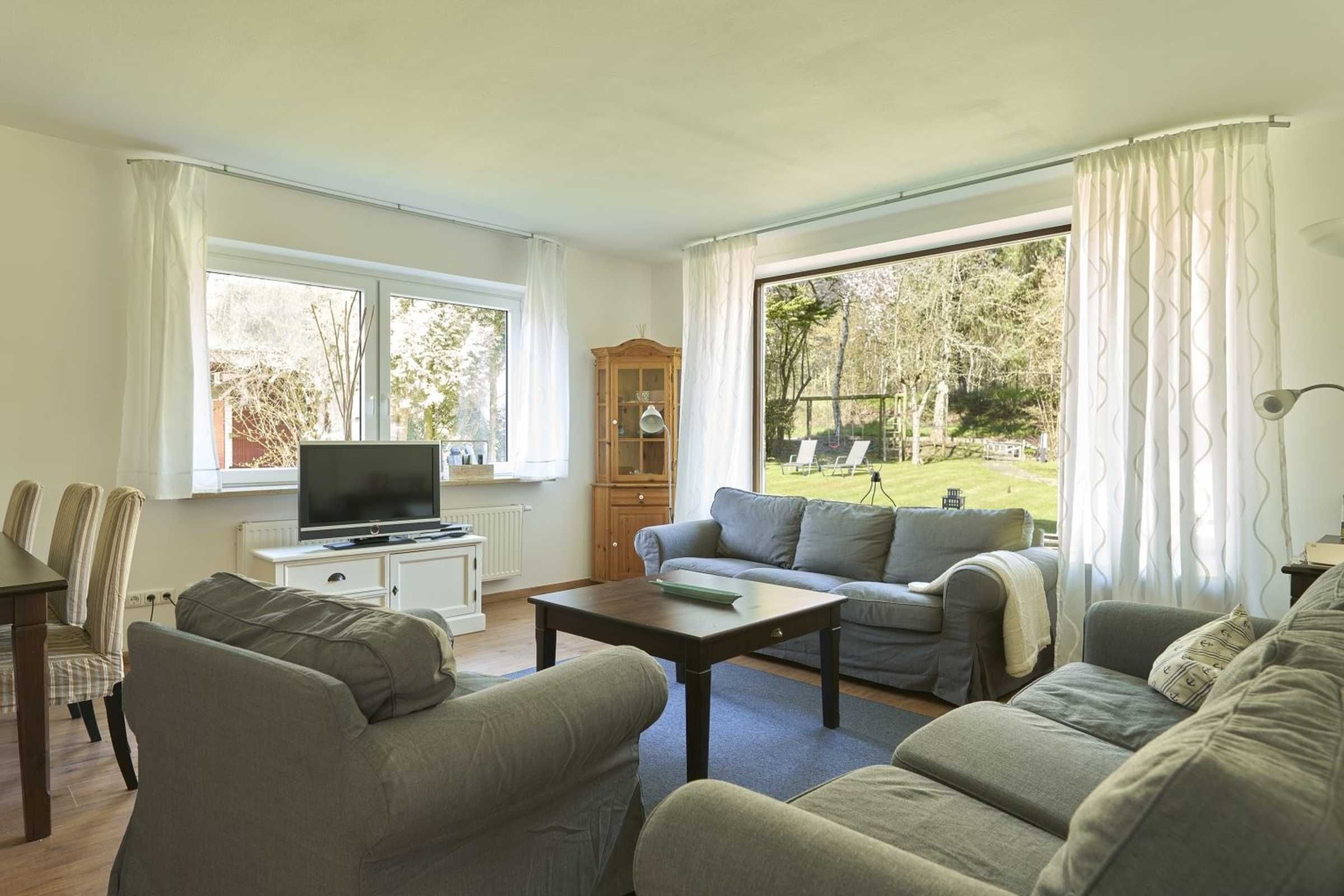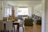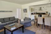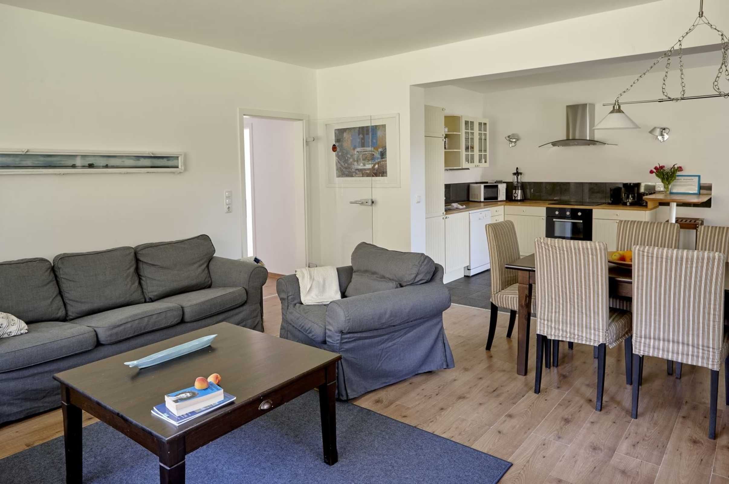 Helles Wohnzimmer mit 2 Sofas, Sessel und SMART-TV (Sat) mit DVD-Player. Direkter Zugang zur möblierten Gartenterrasse nach Süden, windgeschützt und teilweise überdacht. Offene Küche mit allem Komfort (Backofen, Mikrowelle, Geschirrspüler Kühlschrank mit Gefrierfach). Essbereich mit Esstisch und 6 Stühlen.