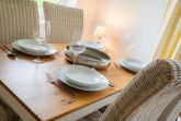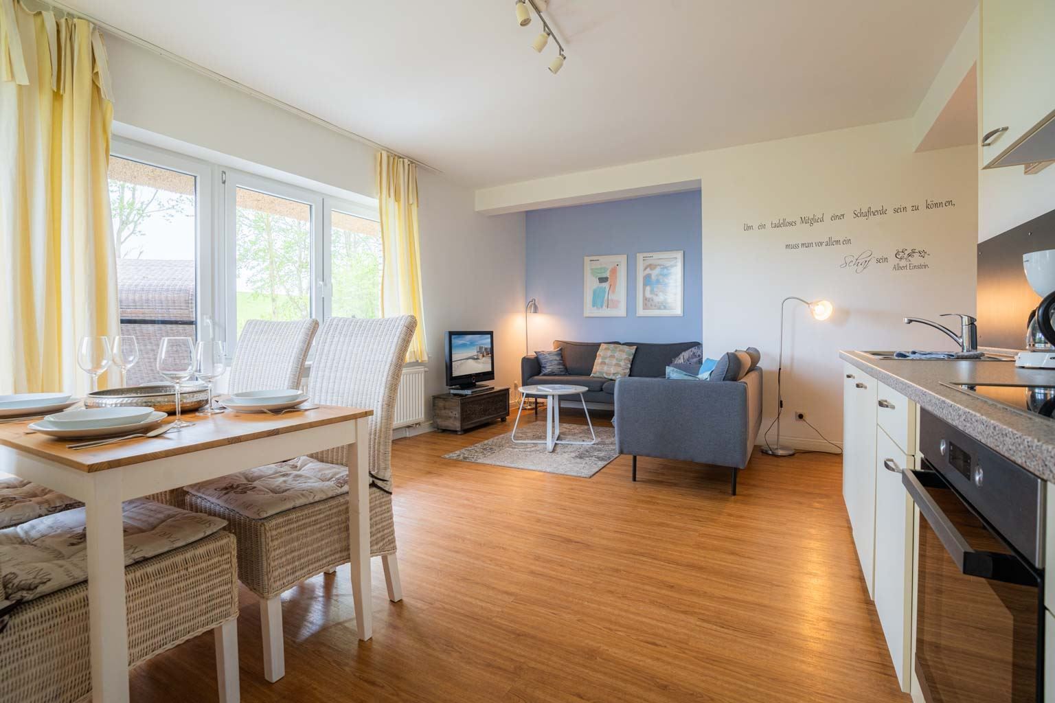 Wohnzimmer mit 2 Sofas, TV (Sat) mit DVD-Player und Esstisch mit 4 Stühlen. Kostenloses WLAN. Direkter Zugang zur möblierten Garten-Terrasse nach Süden. Offene Küche mit Backofen, Mikrowelle, Geschirrspüler und Kühlschrank mit Gefrierfach.