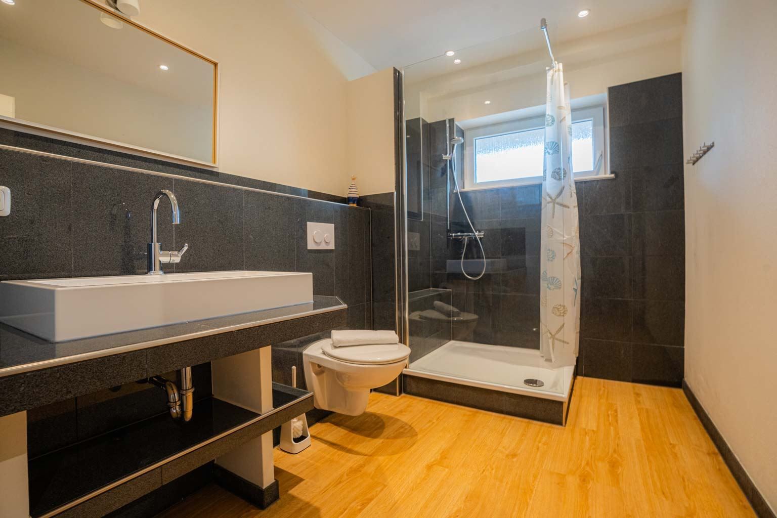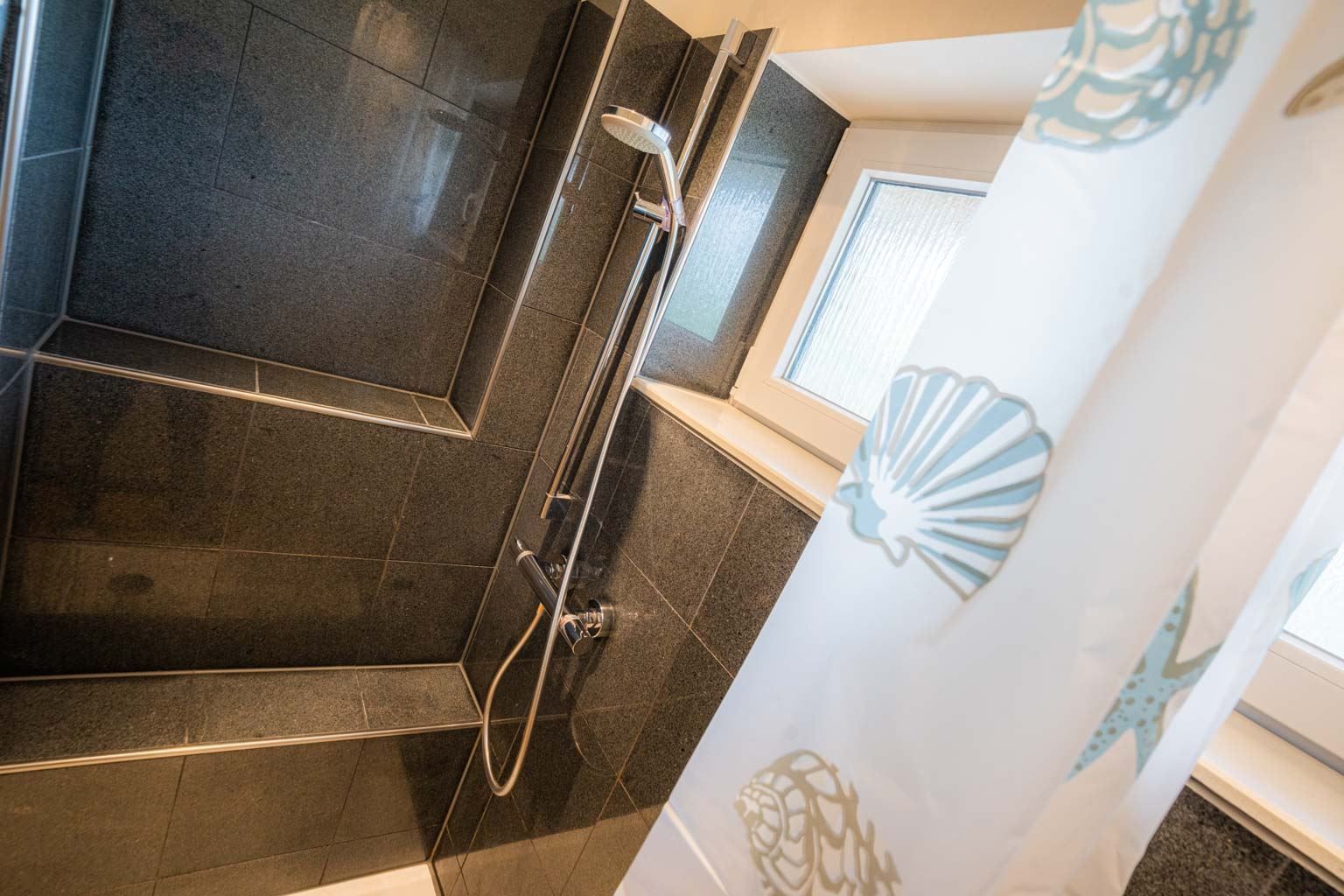 Badezimmer (Duschbad) mit Dusche, WC und Tageslicht.