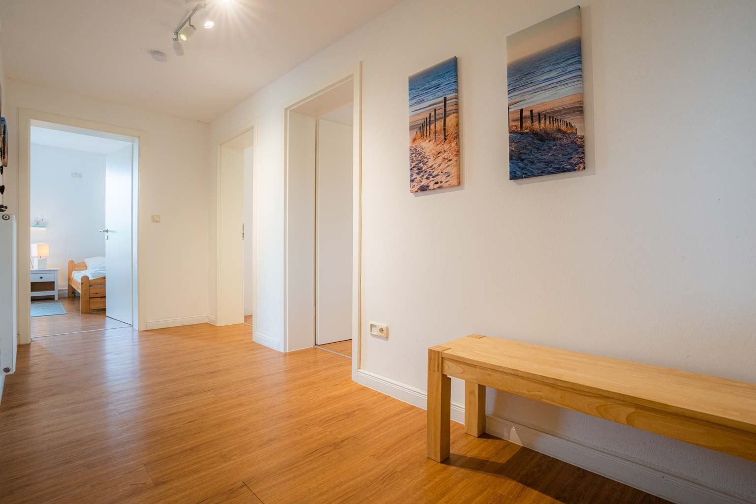 Flur mit Garderobe und Schuhablage im Eingangsbereich der Wohnung. In diesem Domizil sind ein kostenloses Kinderreisebett (nur Gestell, ohne Bettzeug) und ein Kinderhochstuhl vorhanden und können kostenlos genutzt werden.