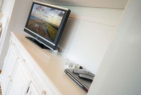 Wohnzimmer mit Sofa, Sessel und TV (Sat) mit DVD-Player. Essbereich mit Esstisch und 2 Stühlen.