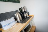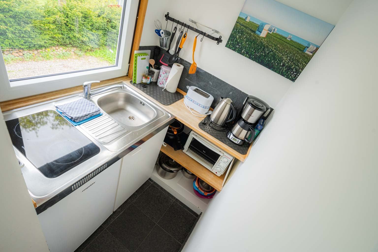 Kleine separate Küche mit 2 Kochfeldern, Mini-Backofen und Kühlschrank mit Gefrierfach.