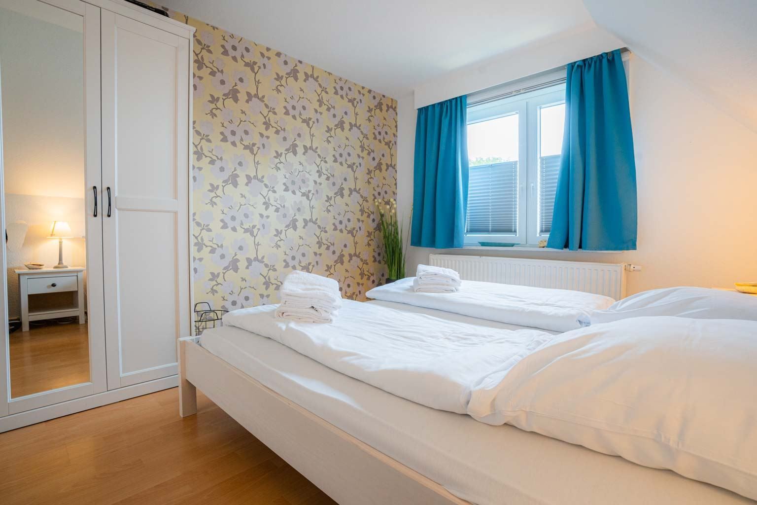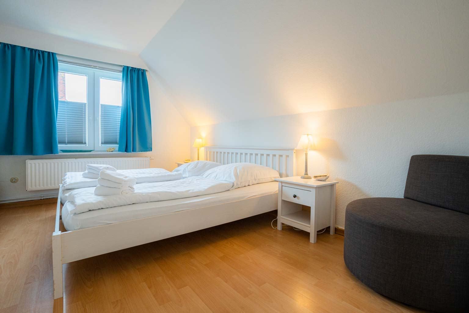 Schlafzimmer mit Doppelbett (2x 90x200cm), Kleiderschrank und Sessel.