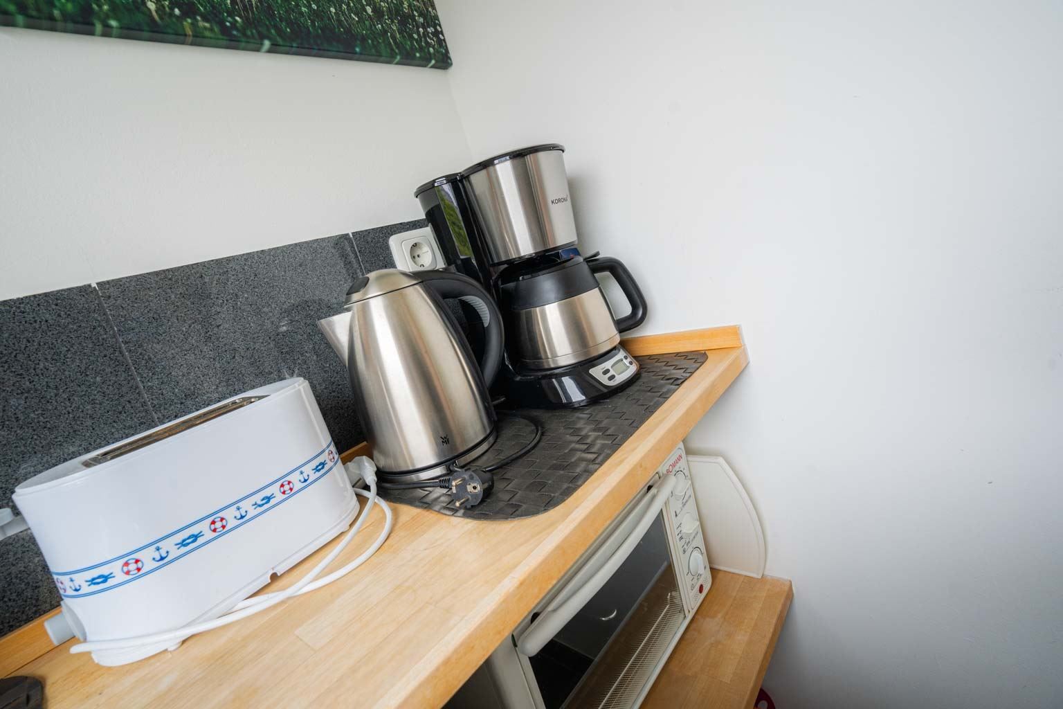 Gemeinschaftlich nutzbare Haushaltsgeräte im Hausflur. Gemeinschaftlicher Waschraum mit Waschmaschine, Wäschetrockner und Bügelset. Großes Gartengrundstück am Waldesrand mit zwei gemeinschaftlich nutzbaren Sonnenfreisitzen und Kinderspielgeräten. Kostenloses WLAN (Glasfaser).