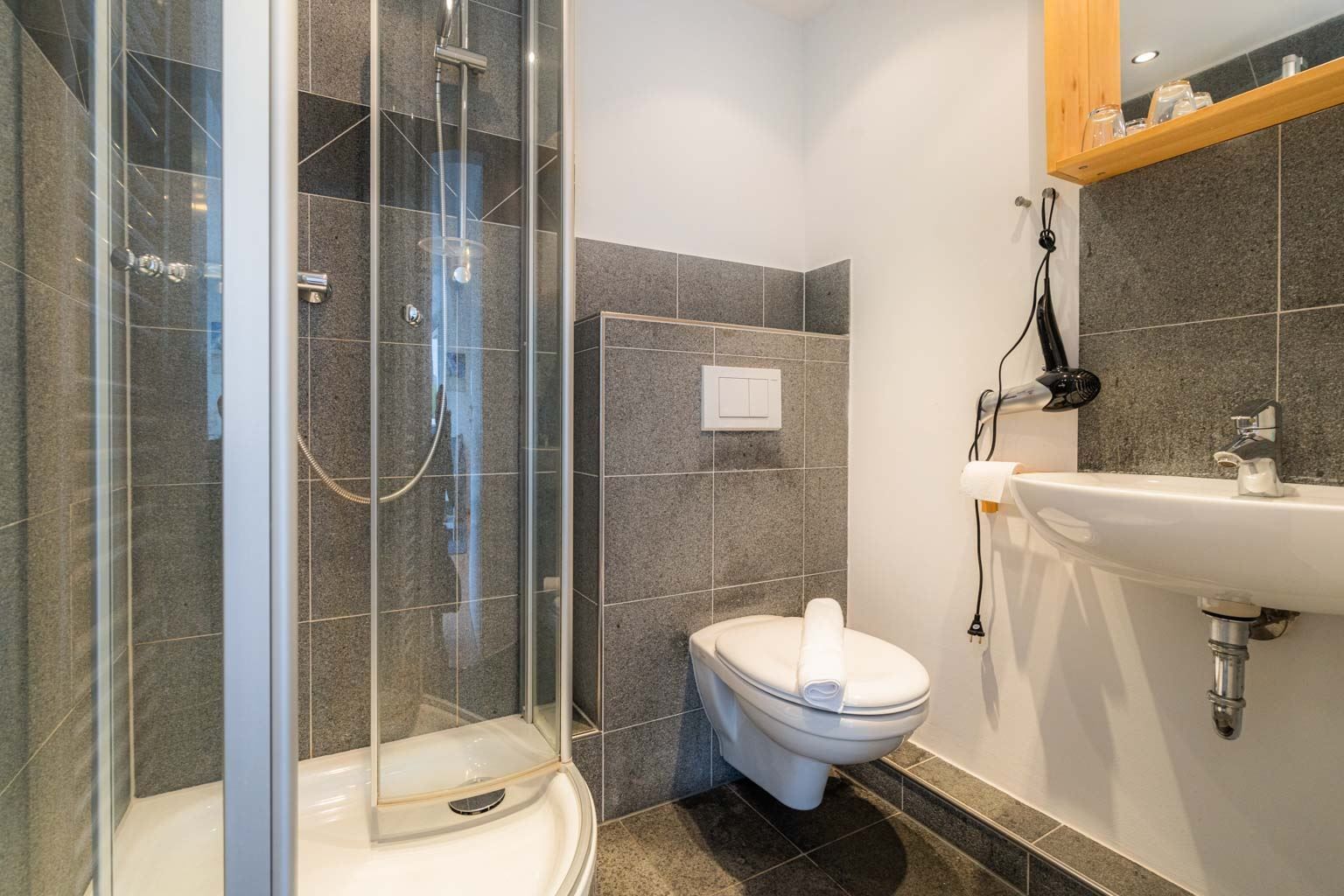 Badezimmer (Duschbad) mit Dusche, WC, Handtuchwärmer und Föhn.