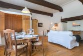 Saunabereich gegen Gebühr vorhanden. Die Schloss-Gäste können die Terrasse sowie den Garten mit Gartenmöbeln, Grillmöglichkeit und Liegewiese mitnutzen. In der ehemaligen Gesindeküche des Westflügels befindet sich heute eine urgemütliche Sitzecke für gesellige Momente. Kinderhochstuhl und Kinderreisebett kostenlos vorhanden (nach Verfügbarkeit).
