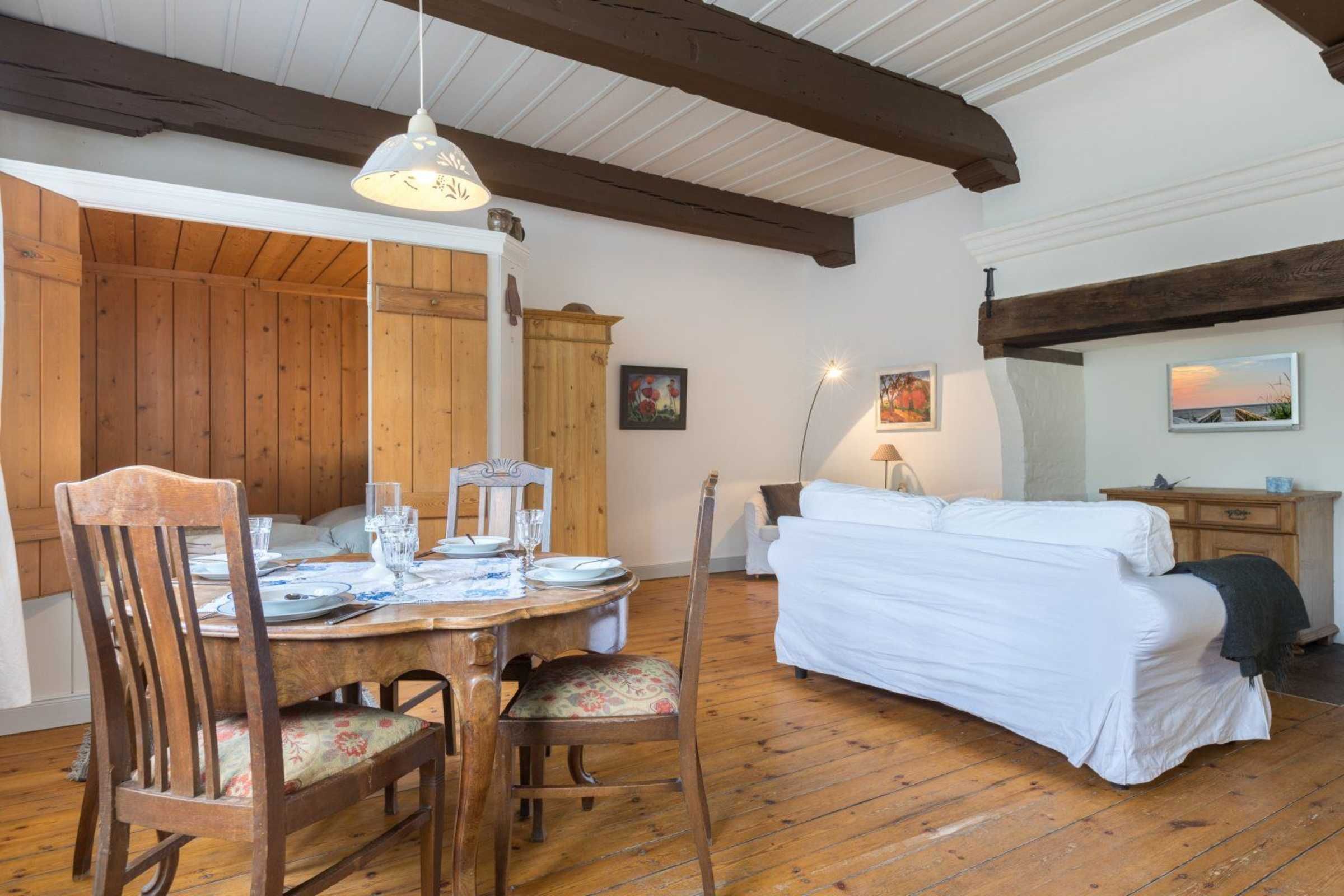 Gemütliche 2-Zimmer-Ferienwohnung Reiherhorst im Herrenhaus Hoyerswort mit ca. 40 qm auf 1 Ebene (Erdgeschoss) für bis zu 4 Personen. In ruhiger Lage im Grünen auf dem Schloss in Oldenswort. Der Holzdielenboden und die historischen Deckenbalken verleihen dieser Wohnung eine einzigartige Atmosphäre. In der Einrichtung vermischt sich die Moderne mit restaurierten Schmuckstücken. Von allen Räumen haben Sie einen schönen Ausblick ins Grüne. Hunde sind herzlich willkommen!