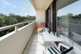 Pkw-Stellplatz am Haus. Fahrradabstellmöglichkeiten vorhanden (nach Verfügbarkeit). Kostenloses WLAN. Gemeinschaftliche Waschmaschinen und Trockner gegen Gebühr im 4. OG, 8. OG und 12. OG des Hauses. Bügelset in der Wohnung vorhanden.