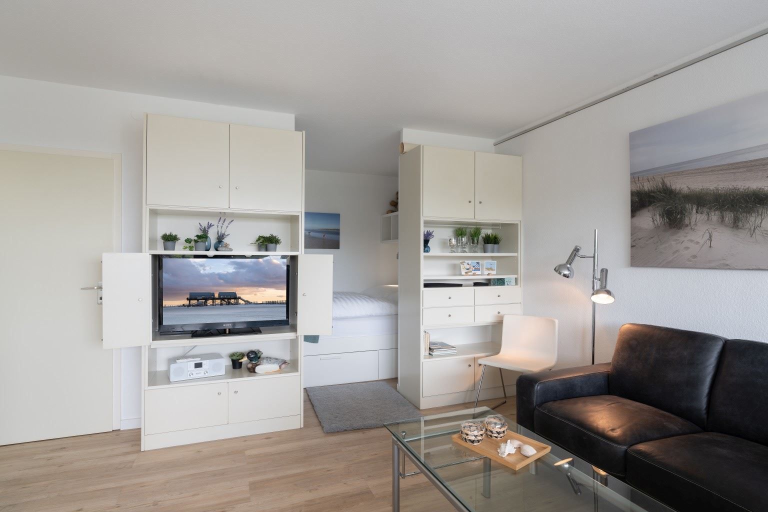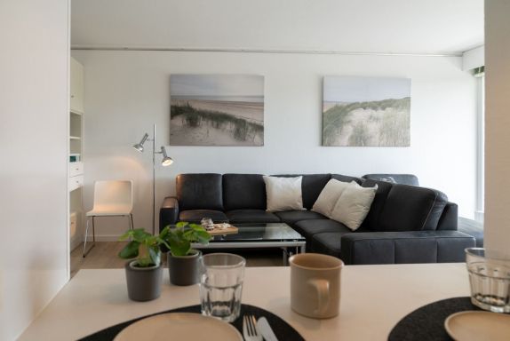 Modern und hell eingerichtete 2 1/2-Zimmer-Ferienwohnung Düne 73 im Haus Atlantic mit ca. 47 qm auf 1 Ebene (4. OG, mit Fahrstuhl) für bis zu 4 Personen. In strandnaher Lage im Ortsteil Bad in St. Peter-Ording.