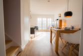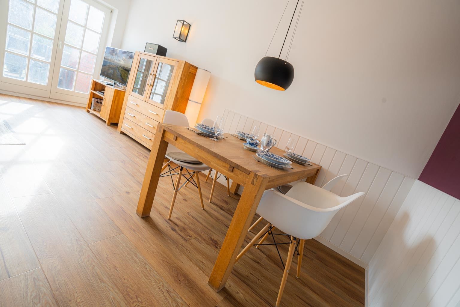 Wohnzimmer mit Sofa und Sessel, SMART-TV (Sat), behaglichem Kaminofen und gemütlichem Essbereich für bis zu 4 Personen. Abstellkammer mit Staubsauger. Direkter Zugang zur möblierten Gartenterrasse nach Südosten.