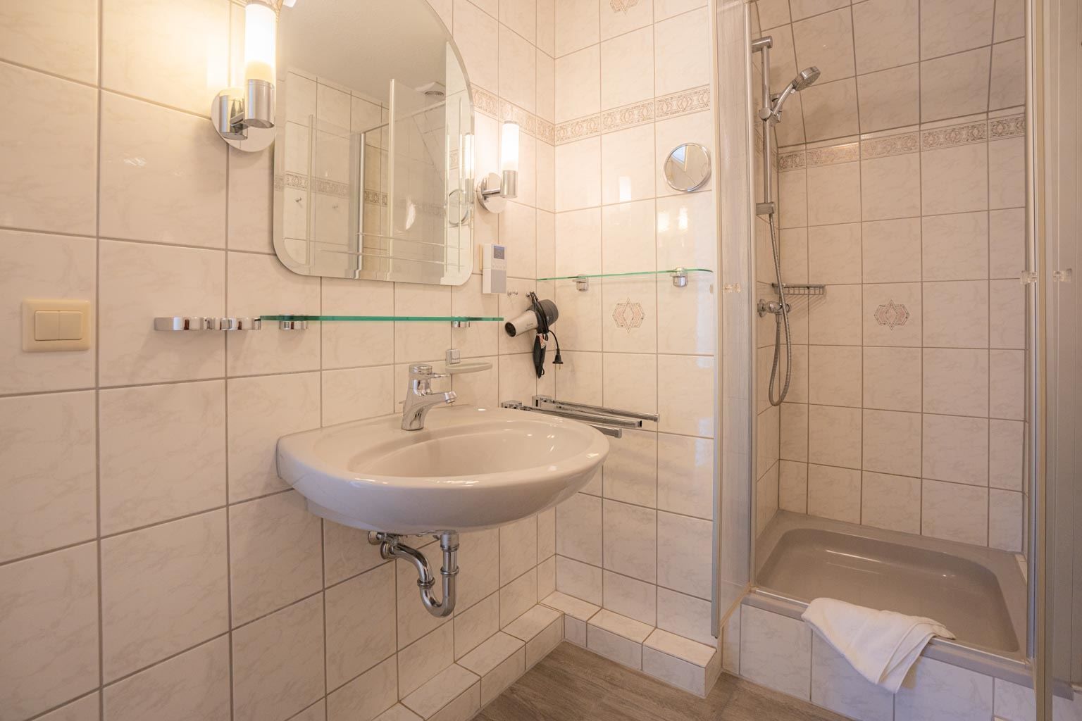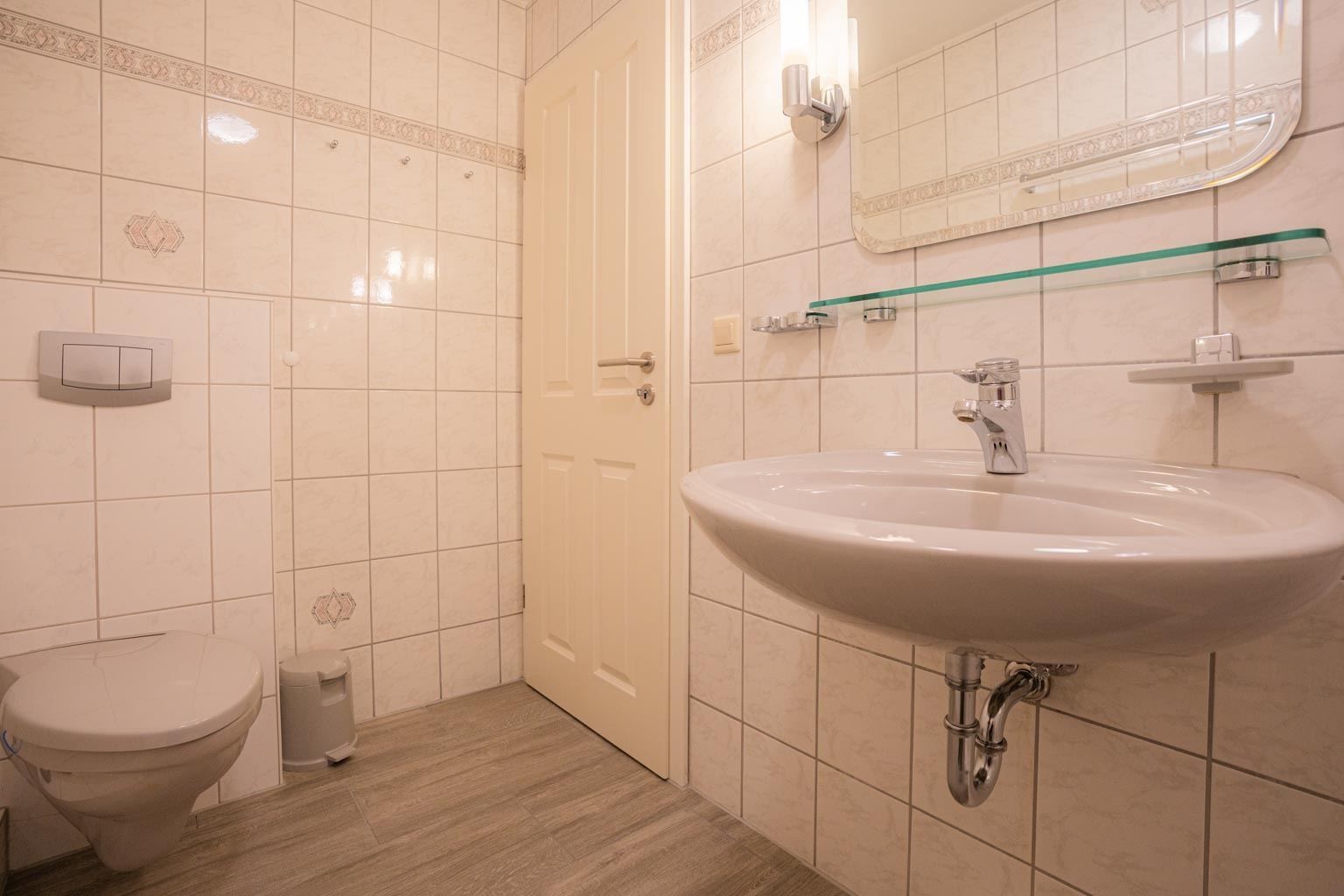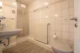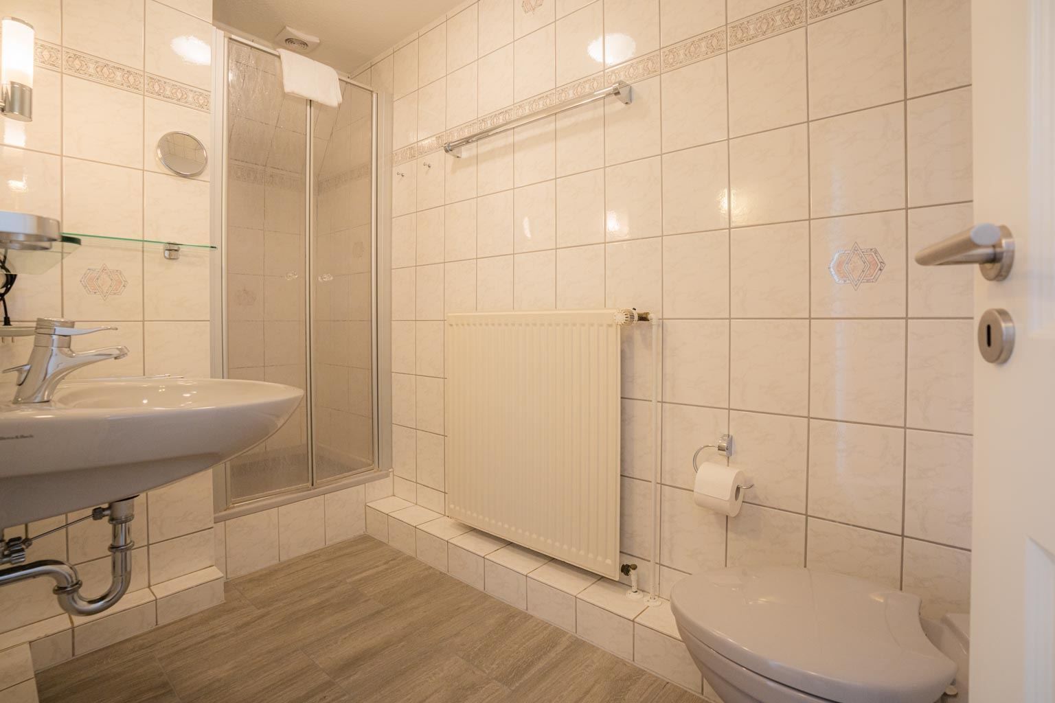 Badezimmer (Duschbad) mit Dusche, WC, Handtuchwärmer und Föhn.