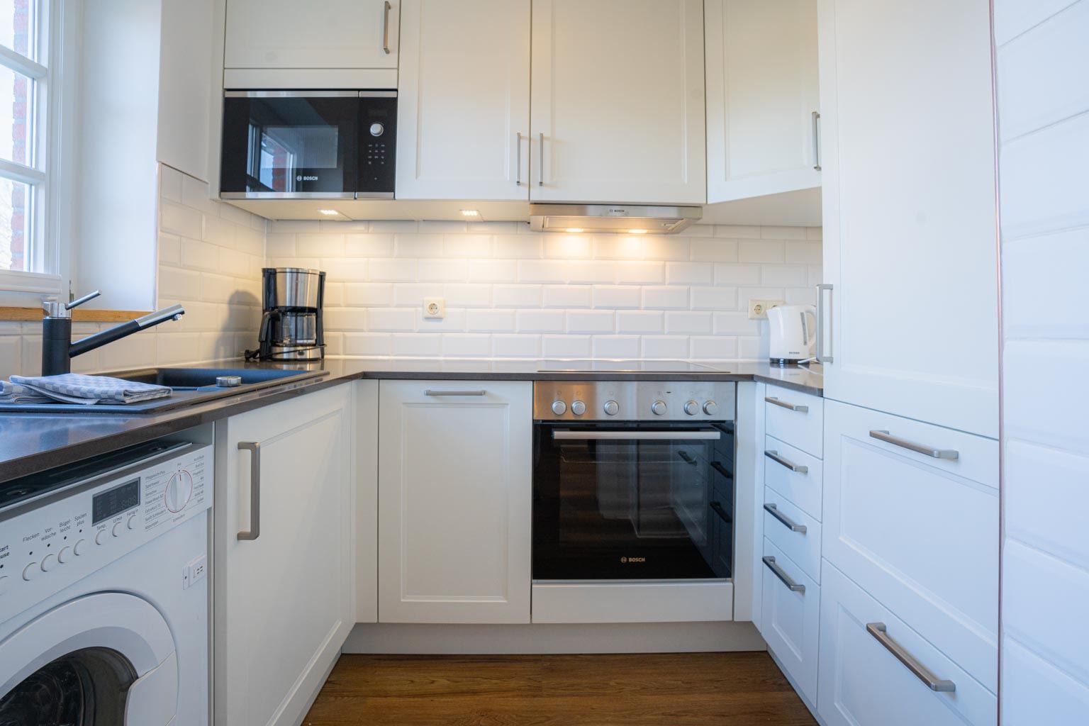 Separate Küche mit Backofen, Mikrowelle, Geschirrspüler und Kühlschrank mit Gefrierfach. In der Küche befindet sich außerdem eine Waschmaschine.