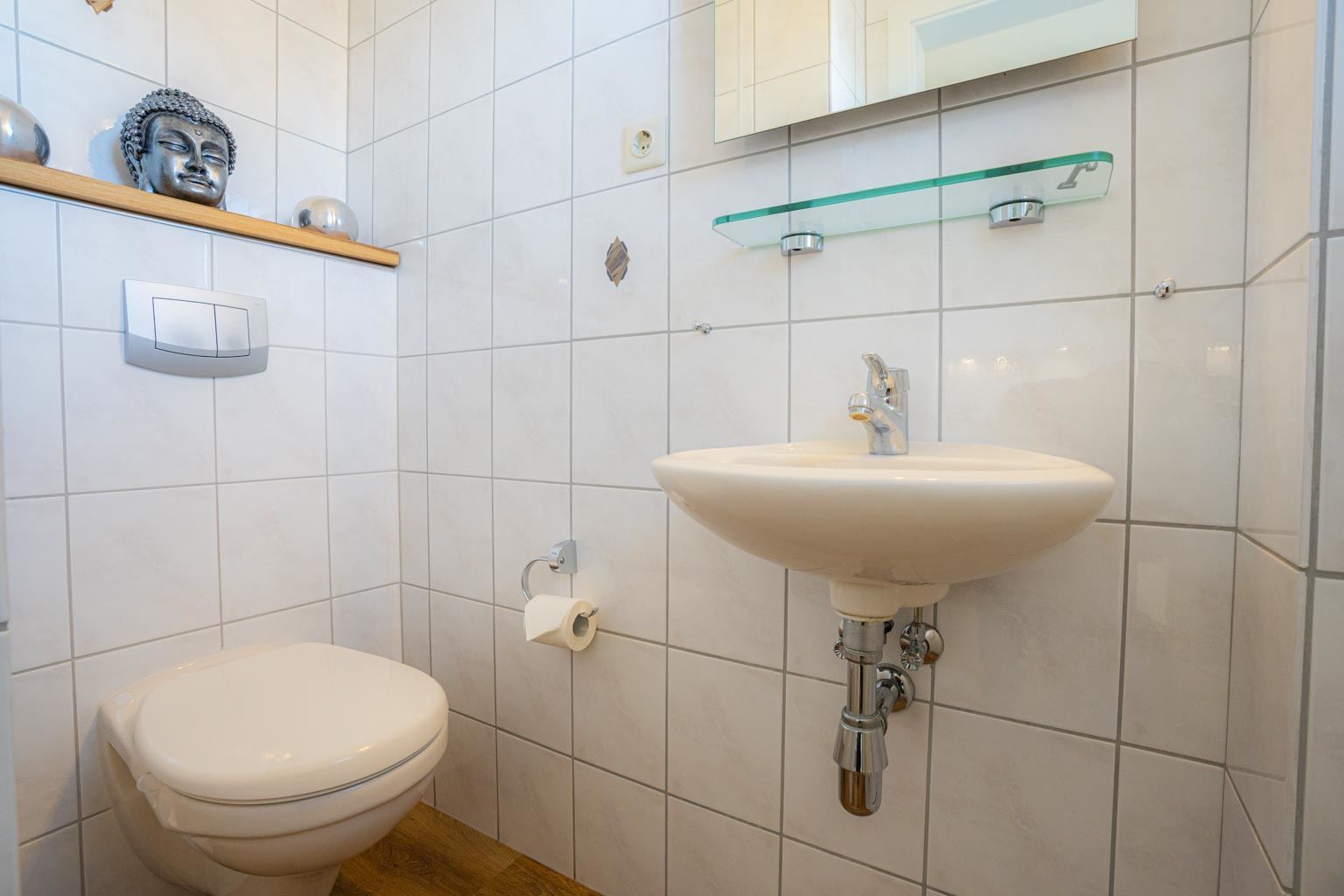 Flur mit Garderobe und Gäste-WC im Eingangsbereich. Kostenloses Kinderbett (nur Gestell) und Kinderhochstuhl sind vorhanden. Zum Haus gehören ein Pkw-Stellplatz und ein abschließbarer Fahrradschuppen. Kostenloses WLAN.