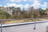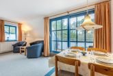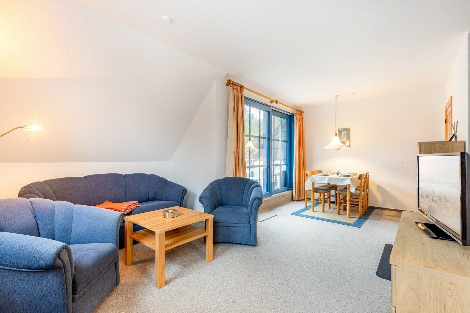 Wohnzimmer mit 1 Sofa und 2 Sesseln, TV (Kabel), Radio mit CD-Player, Esstisch mit 4 Stühlen und Kaminofen. Direkter Zugang zum möblierten, windgeschützten Balkon nach Südwesten mit schönem Ausblick auf das angrenzende Wäldchen.