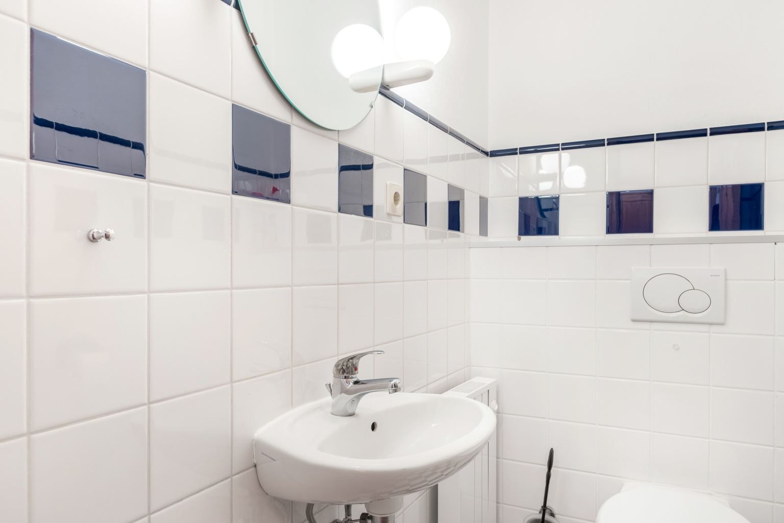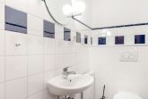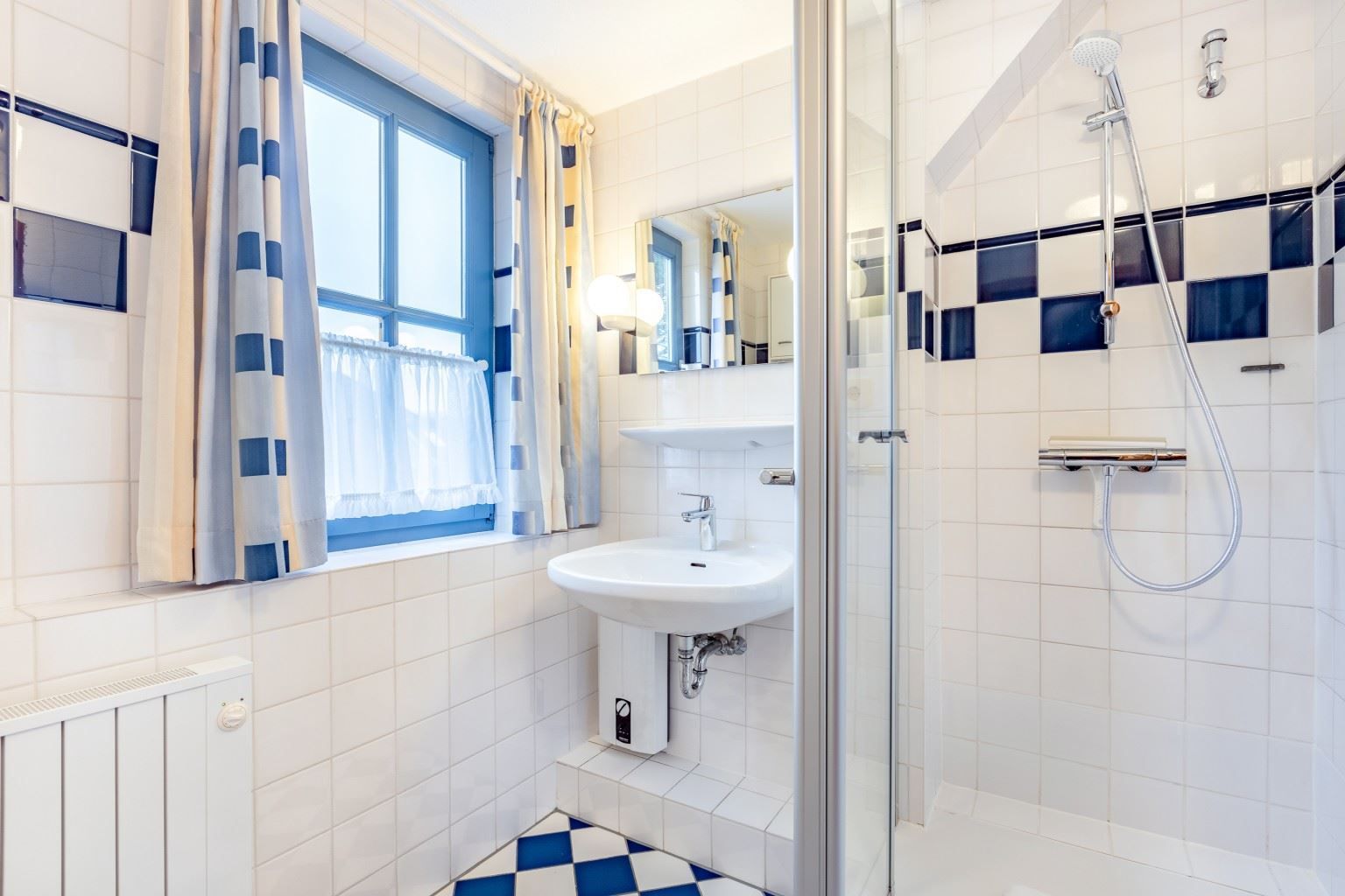 Badezimmer (Duschbad) mit Dusche, Föhn und Tageslicht. Separates WC mit Waschbecken.