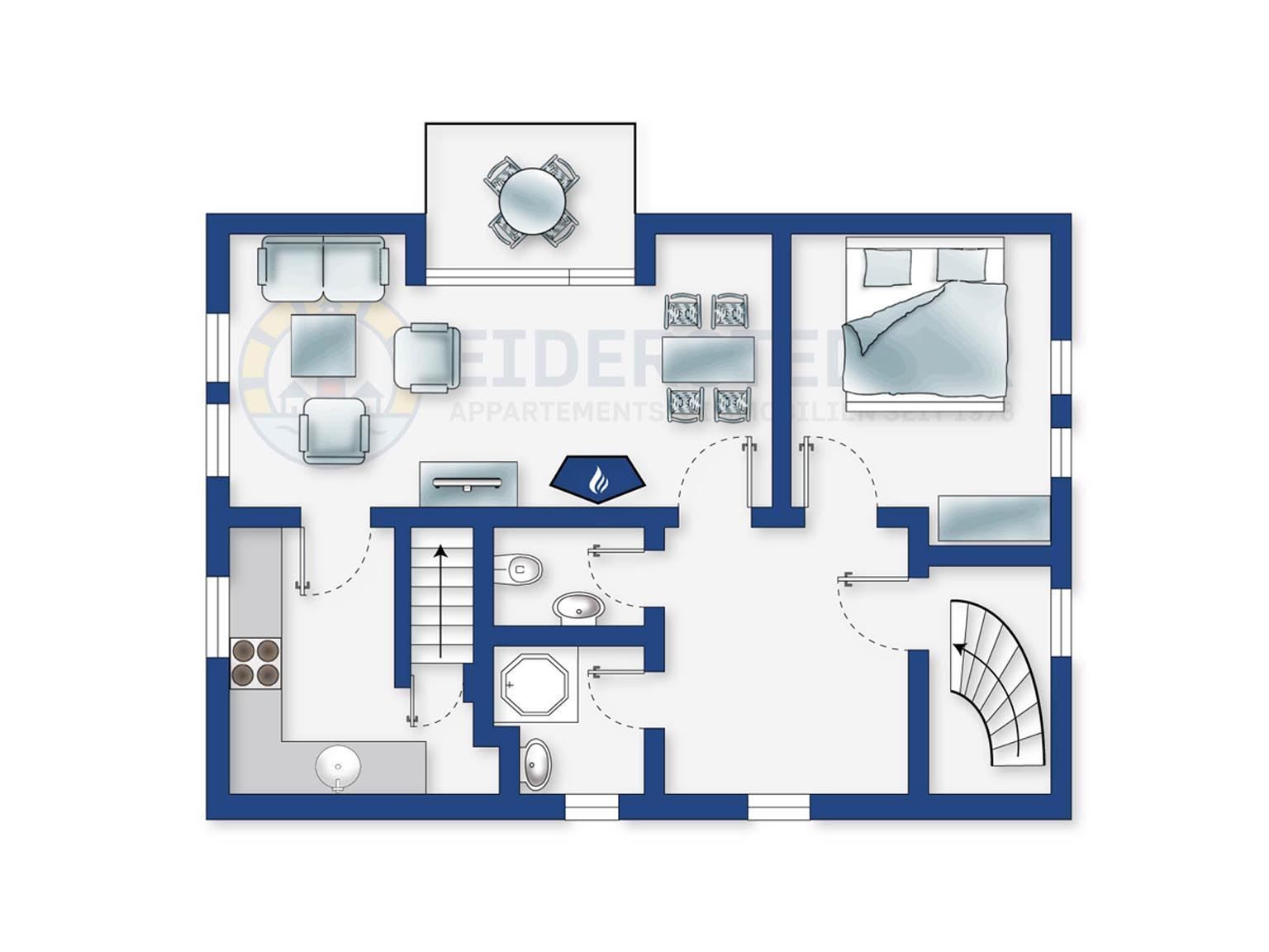 Gemütliche 3-Zimmer-Ferienwohnung Sven im Haus Carstens mit ca. 60 m² auf 2 Ebenen (OG, DG) für bis zu 4 Personen. In ruhiger Lage am Ende einer verkehrsberuhigten Straße im Ortsteil Bad in Sankt Peter-Ording. Das Grundstück grenzt an ein Wäldchen.
