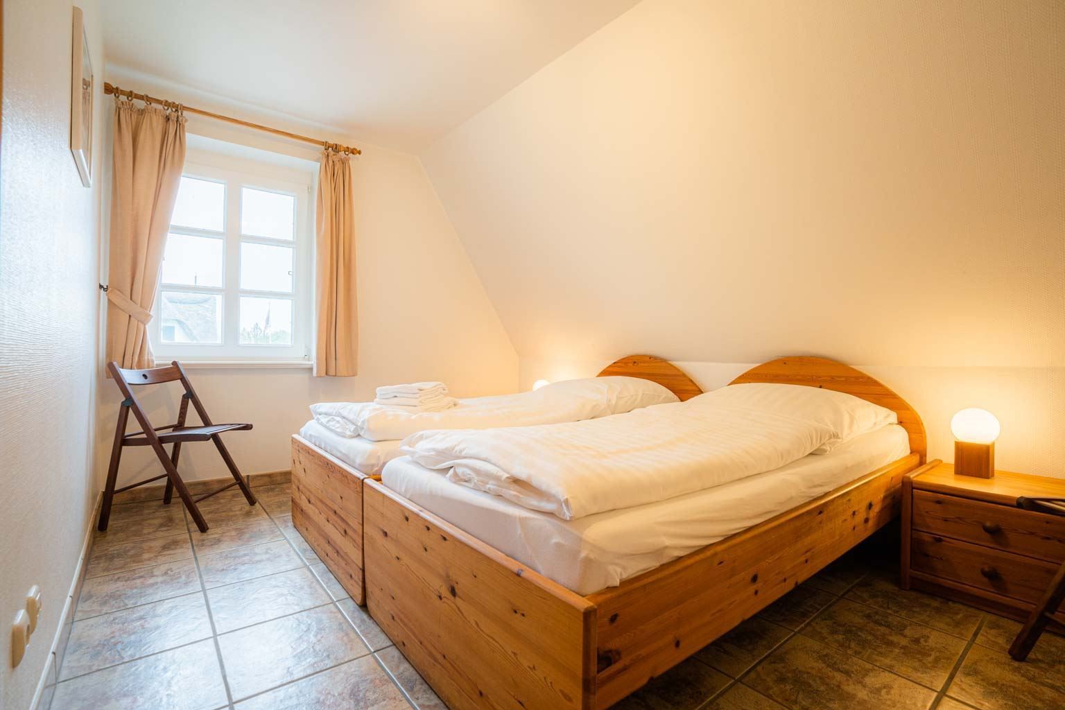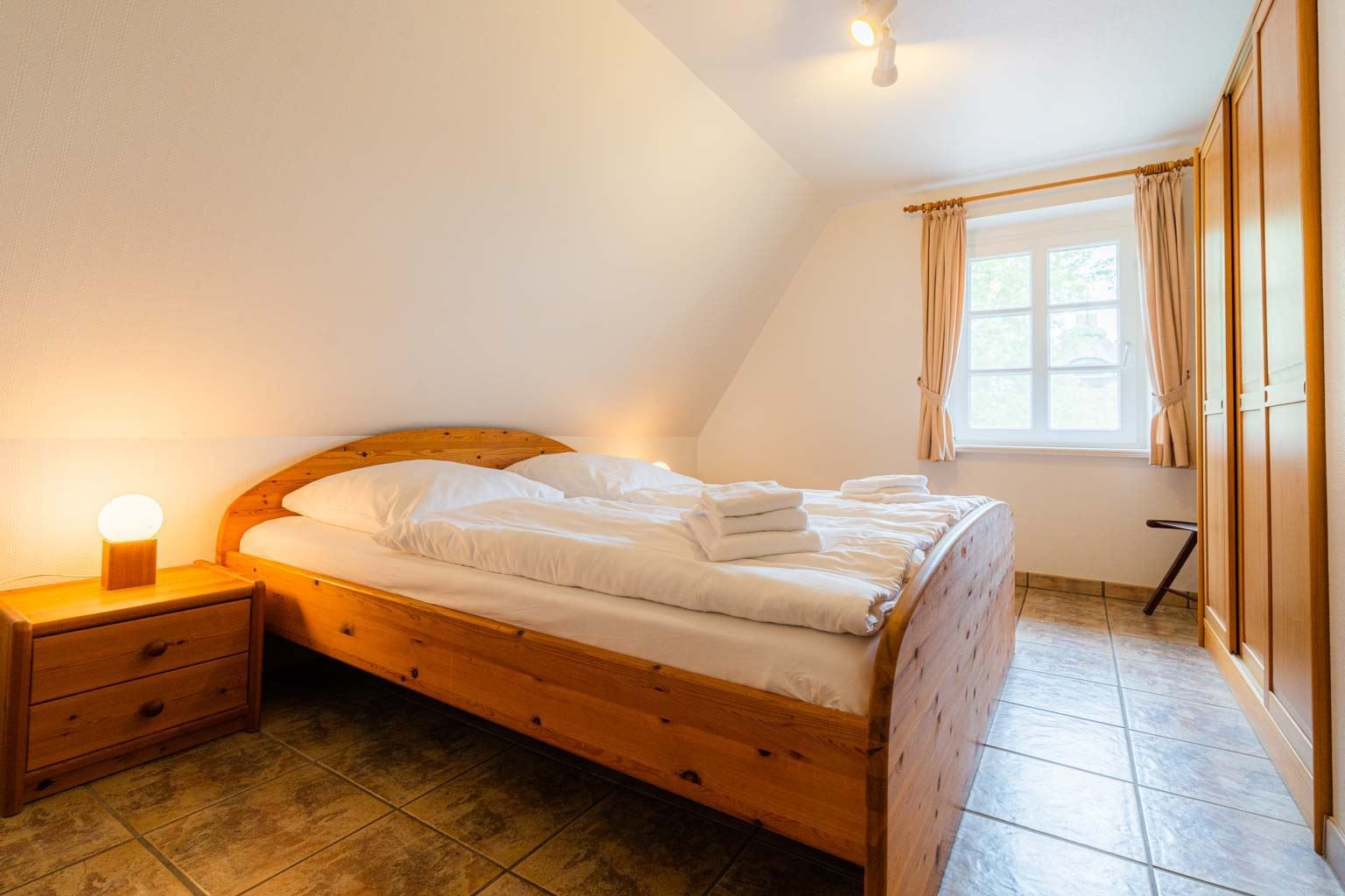 1. Schlafzimmer mit Doppelbett (2x 90x200cm), Kleiderschrank, Sideboard, Spiegel und 2 Stühlen.