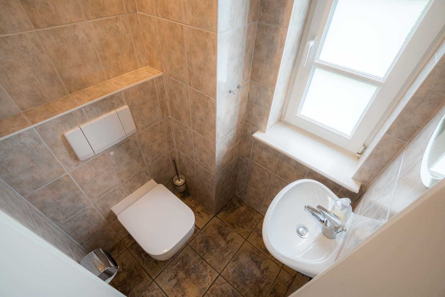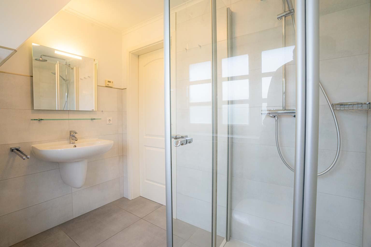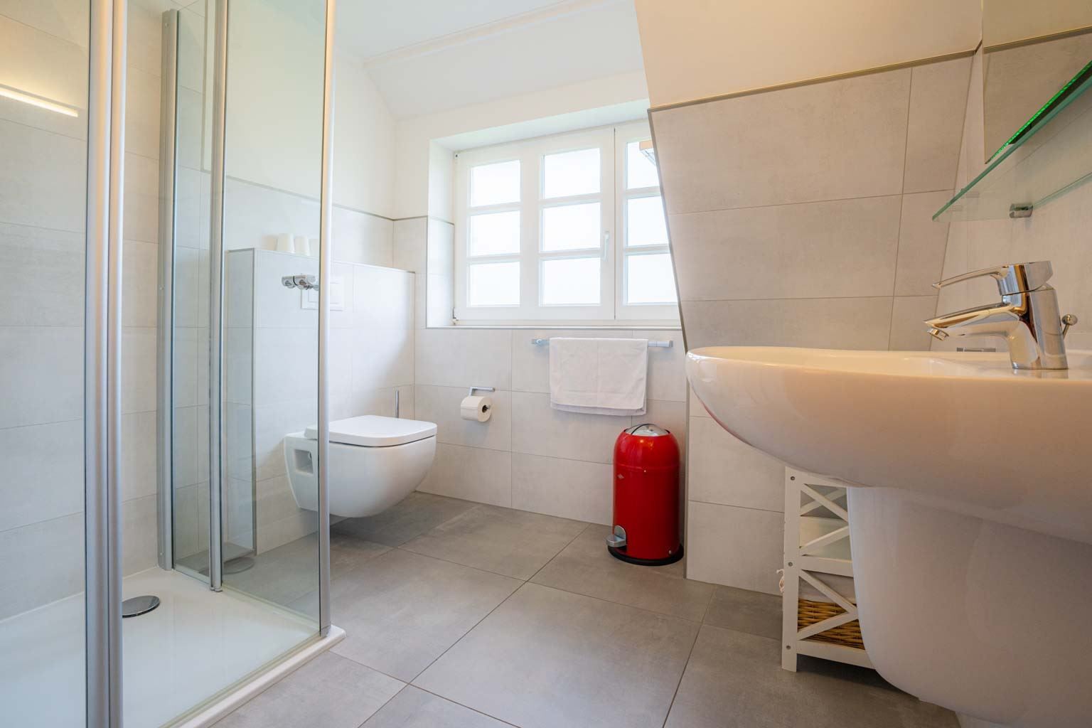 Badezimmer (Duschbad) mit Dusche, WC, Tageslicht und Föhn.