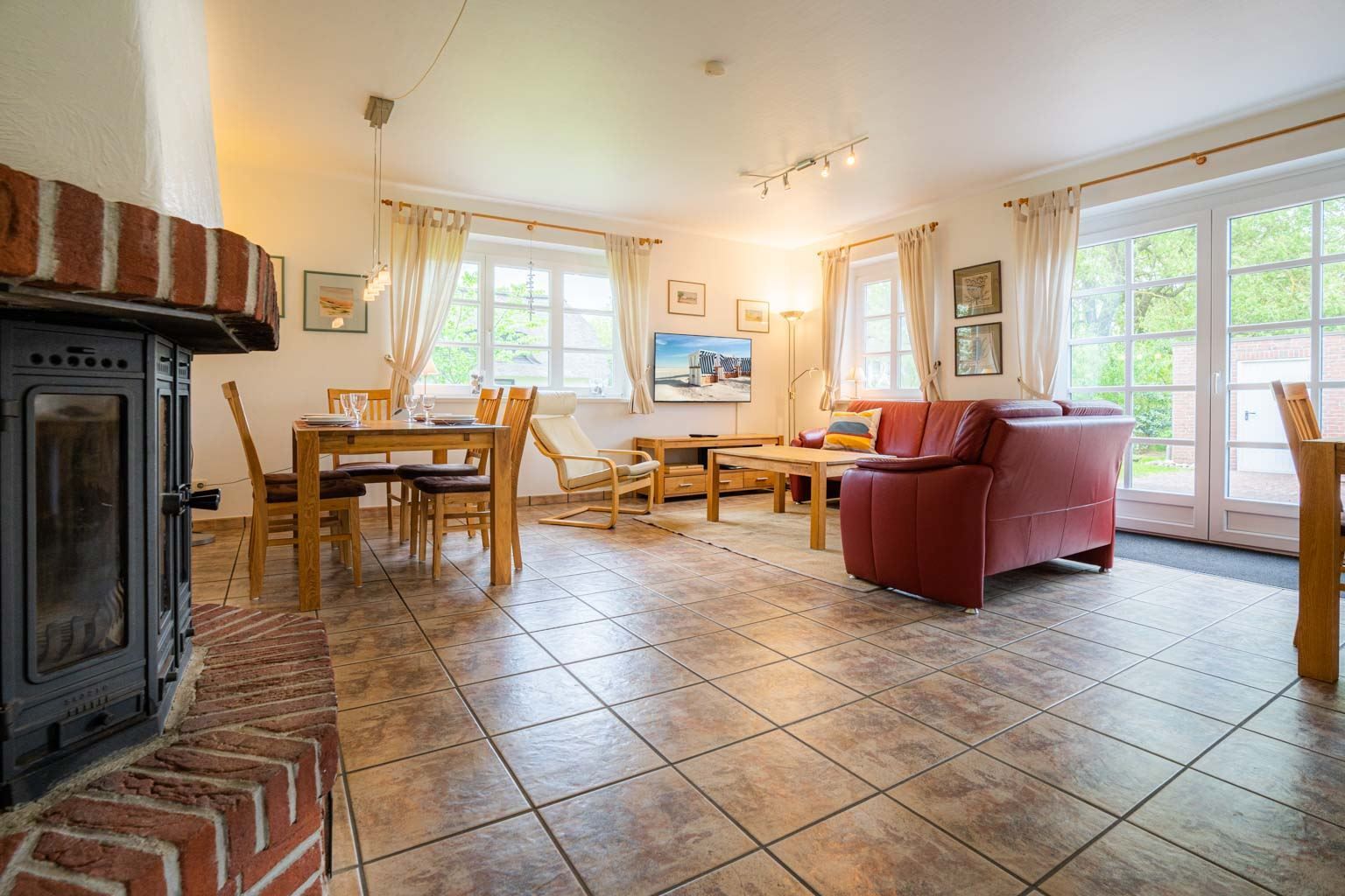 Wohnzimmer mit 2 Sofas (3er und 2er), Sessel, TV (Kabel), Stereo-Anlage mit CD-Player, Esstisch mit 6 Stühlen und gemütlichem Kamin. Schreibtisch mit Telefon. Direkter Zugang zur möblierten Gartenterrasse nach Osten.