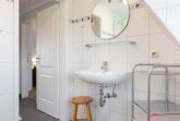 Flur mit Garderobe, Schuhablage, Spiegel und Gäste-WC mit Tageslicht. Hauswirtschaftsraum mit Waschmaschine (Toploader), Staubsauger und Bügelset.