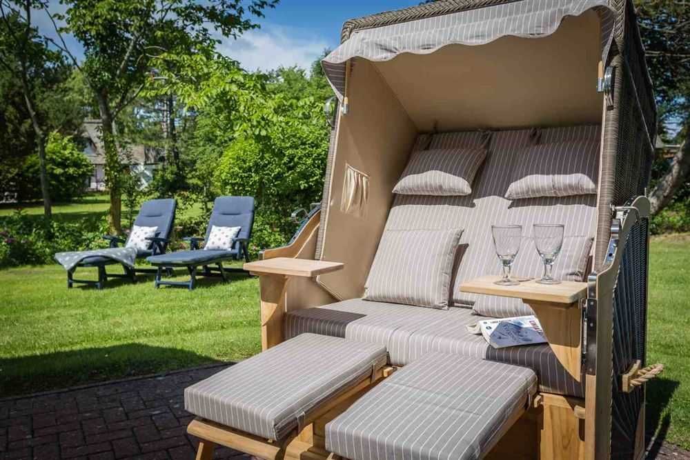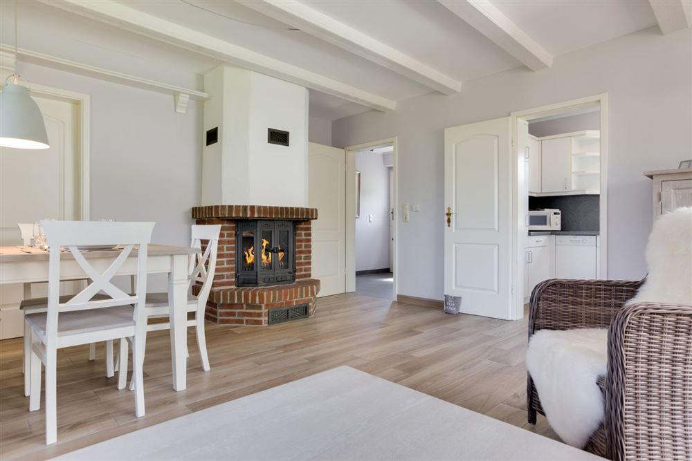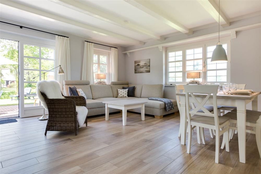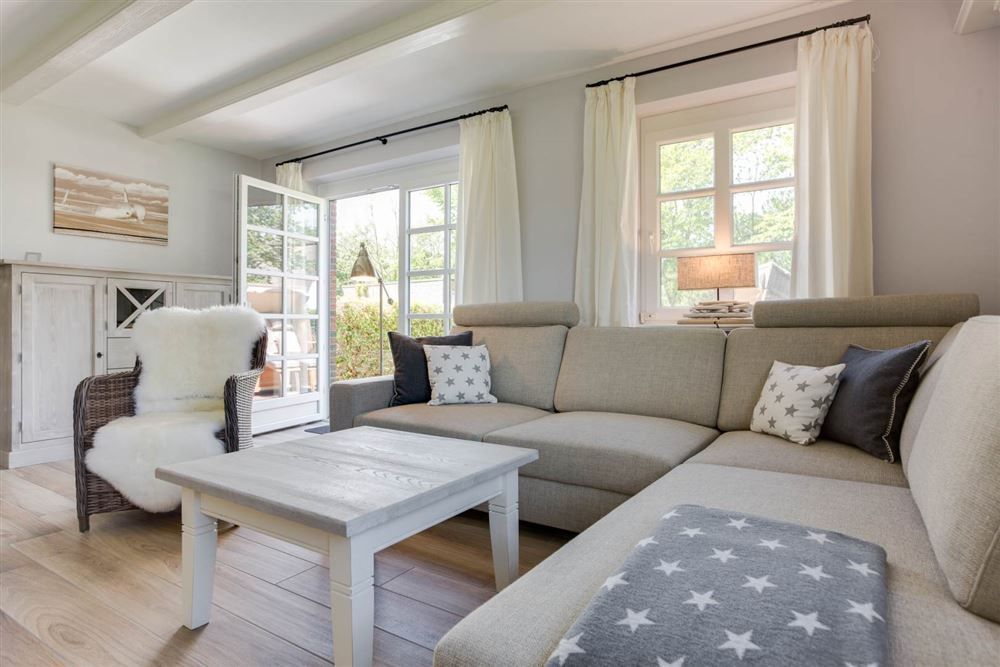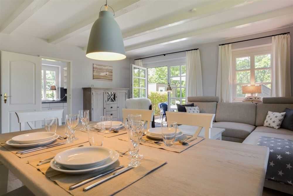Wohnzimmer mit großem Ecksofa (für 3-5 Personen), Sessel, großem TV (Kabel), Esstisch für 6 Personen und Kamin. Direkter Zugang zur sonnigen, möblierten Gartenterrasse nach Westen mit Strandkorb.