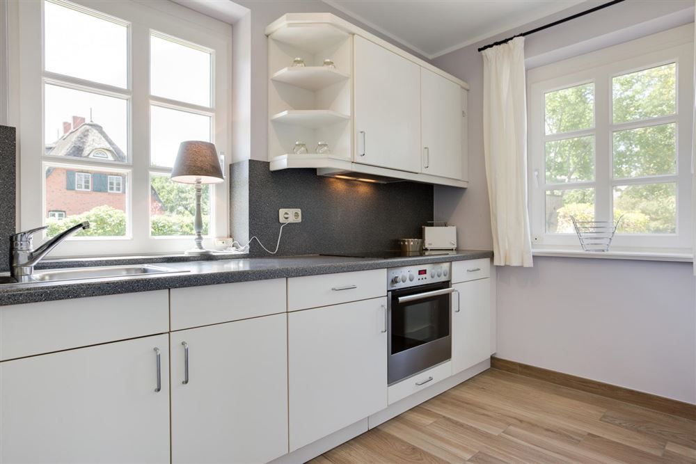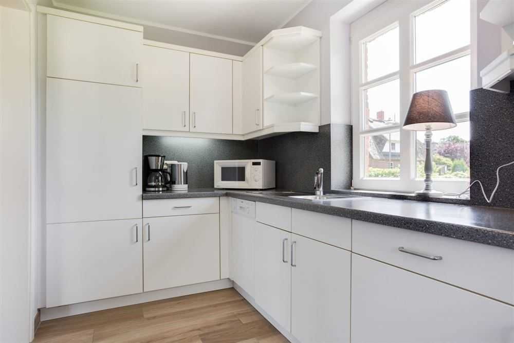 Separate Küche mit Backofen, Mikrowelle, Kühlschrank mit Gefrierfach und Geschirrspüler.