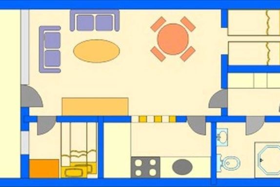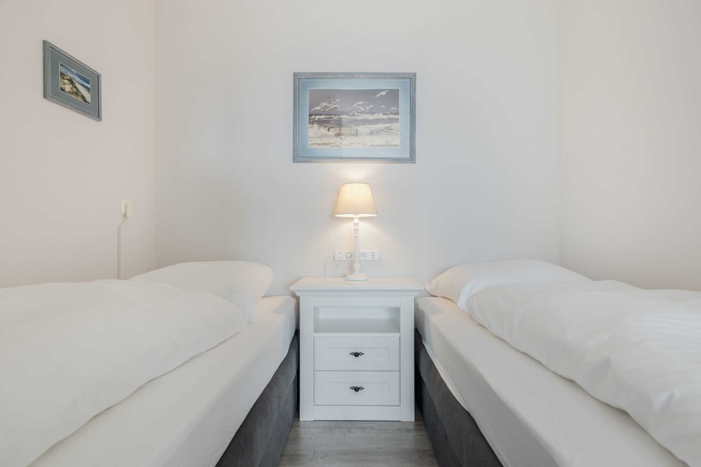 1. Schlafzimmer mit 2 Einzelbetten (je 90x200cm) und Nachtschränkchen. Dieses Schlafzimmer ist durch einen Vorhang vom Wohnzimmer abgeteilt.
