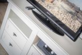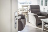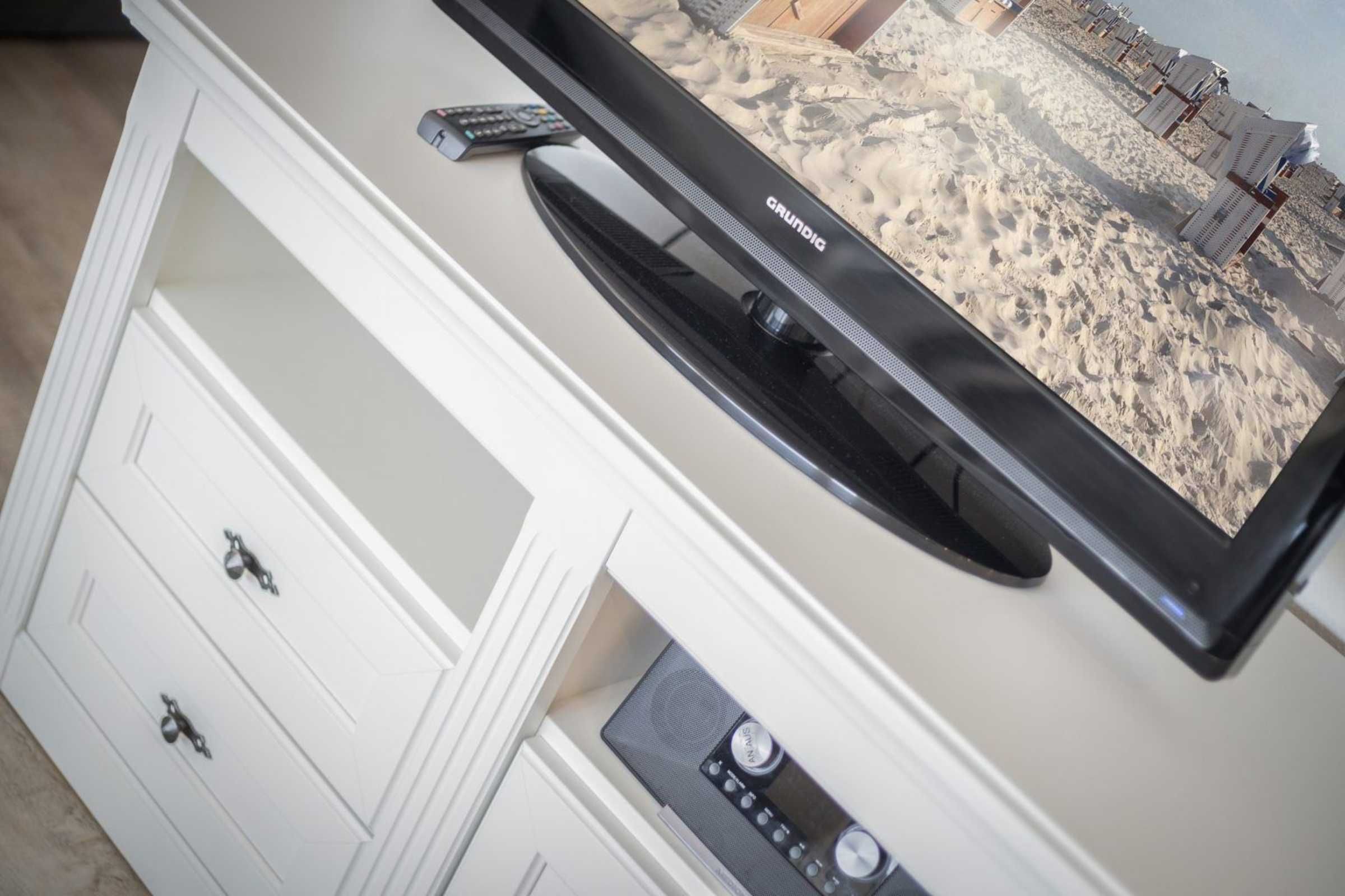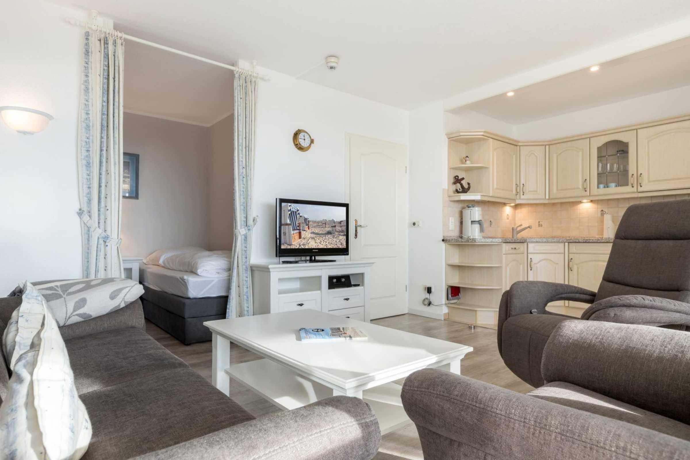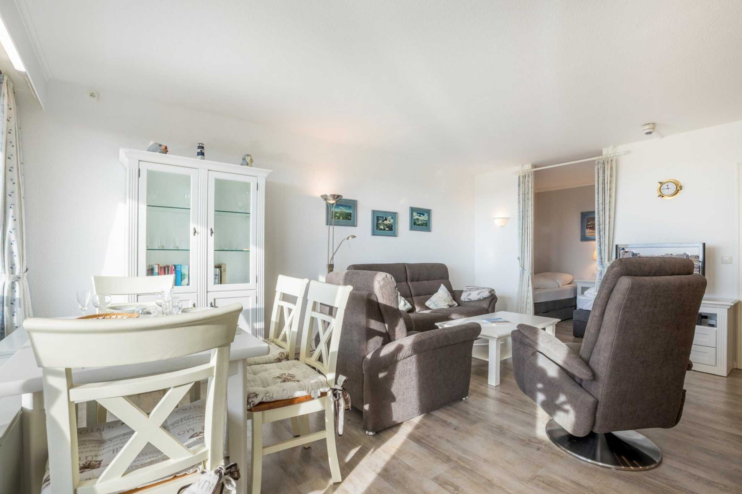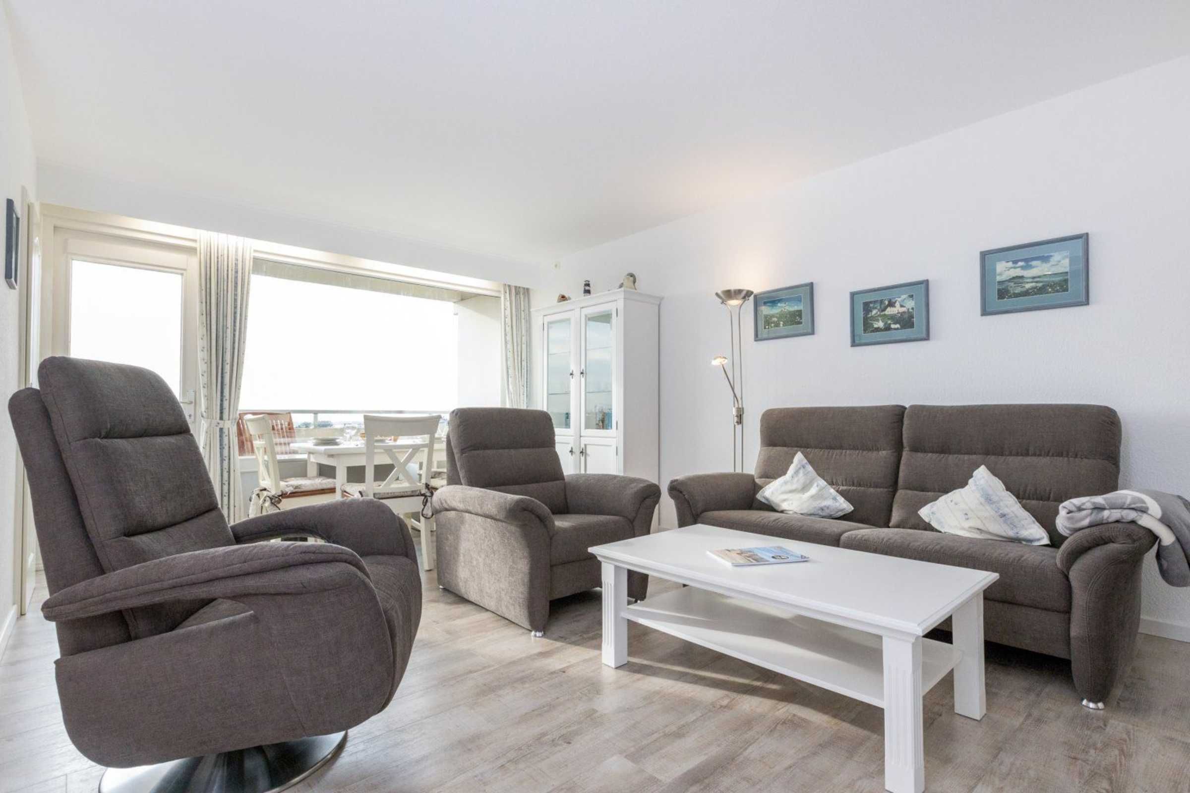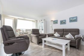Wohnzimmer mit Sofa (3er), 2 Sesseln, Esstisch mit 4 Stühlen, TV (Sat) und Radio. Direkter Zugang zum möblierten Balkon nach Südwesten. Bei guter Sicht haben Sie einen tollen Ausblick auf den Westerhever Leuchtturm. Offene Küche mit Backofen, Mikrowelle, Geschirrsprüler und Kühlschrank ohne Gefrierfach.